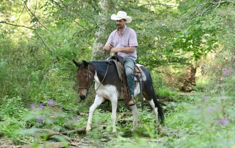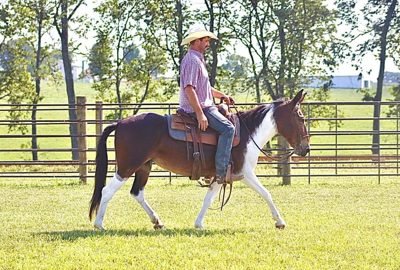 ONLINE AUCTION Place your bids at www.PlatinumEquineAuction.com Starting Bid $3500 Auction ends September 15th, 2024 Need a new saddle? Check out White Rock Saddles on our website or Facebook! Vegas is an 8 year old, 14.1 hand hand Molly mule. Her unique bay and white color is sure to be the talk of the town, and there won’t be another one like her out and about! We have had all levels of riders on Vegas. She rides the best on a full drape with a nice, level head. She prefers to walk and jog, but does lope happily across the pastures and fields. Vegas does all natural obstacles on the trails. She loves the water, and goes nicely down steep banks and hills. She walks over logs. She rides out alone or with the group. Vegas rides quietly with an experienced rider and takes care of them on the trails. We have taken her downtown to ride and she does well with the hustle and bustle of the city. She is a great ranch mule. She’s comfortable around cattle riding through the herd checking them daily. She will sort pairs, load trucks, and rope/doctor cattle. When it comes to work and riding, there isn’t much she can’t do. Vegas is good to take on camping tie out to the high line. Her good looks and thick hair are not what you see on mules often, but Vegas has it! For more information, please call Sammi Waugh 704-798-5497 Located in Brooksville, KY. ONLINE AUCTION Place your bids at www.PlatinumEquineAuction.com Starting Bid $3500 Auction ends September 15th, 2024 Need a new saddle? Check out White Rock Saddles on our website or Facebook!