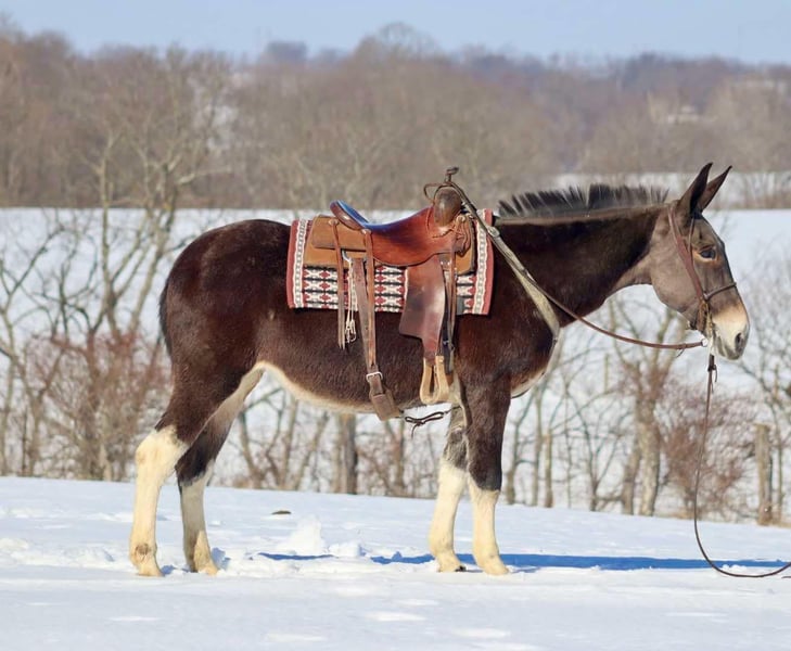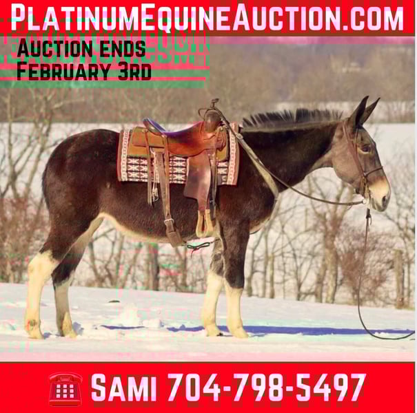 ONLINE AUCTION Place your bids at www.PlatinumEquineAuction.com Starting Bid $3500 Auction ends February 3rd, 2025 Need a new saddle? Check out White Rock Saddles on our website or Facebook! Trixie is a 15.2 hand, 10 year old Molly mule. She is a big, eye catching Molly! Trixie has a nice, ground covering walk that gets you down the trail. She rides out alone or with a group. Alone, Trixie rides out confidently. She easily crosses water, slides down banks, steps over logs, and goes through ditches. She will ride across bridges as well. Trixie rides out with a group. She will lead or follow with no issues. When leading, she keeps a nice pace and when following, she doesn’t try to overtake the horses or mules in front of her. If riding with younger horses and mules, Trixie offers confidence to them. You can ride Trixie English or western with no issues. Previously, Trixie was used for English lessons for intermediate riders. Trixie hauls well by herself or with others. She loads and unloads easily. She is good to bathe and doesn’t mind the clippers. She also gets along well turned out in the herd. Trixie is a nice, big, solid molly that is a safe and dependable trail riding partner. She is ready to hit the Arizona winter riding trails! For more information please call or text Sammi Waugh 704-798-5497 Located in Brooksville, KY. ONLINE AUCTION Place your bids at www.PlatinumEquineAuction.com Starting Bid $3500 Auction ends February 3rd, 2025 Need a new saddle? Check out White Rock Saddles on our website or Facebook!