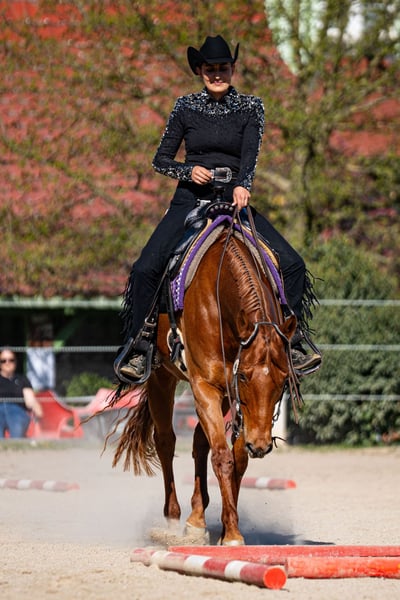 Due to a reduction in herd size, we are looking for a loving new home for this 5-star rated horse. Shez Hung in the Moon, 2015, AQHA mare. Nicknamed "Ginger" Presidental Order x Dress Western mare A beautiful, expressive 10-year-old Quarter Horse mare standing 16.3 hh, available for sale. "Ginger" is a talented all-round pleasure mare. She competes in Pleasure, Horsemanship, Trail, Ranch Riding, and Western Riding. She loves trail rides and free lunge work. Whether as a leisure horse or for competition, she leaves nothing to be desired. This year, she was regularly ridden by an eleven-year-old girl, and "Ginger" performed exceptionally well. She is very well-behaved and completely reliable in handling. A wonderful, patient teacher. She has been introduced to competition for the first time this year, and "Ginger" clearly enjoyed it, always placing highly. She is shod in front, lives in an active stable, and is also familiar with paddock box turnout. We are hoping to find her an ideal, top placement.