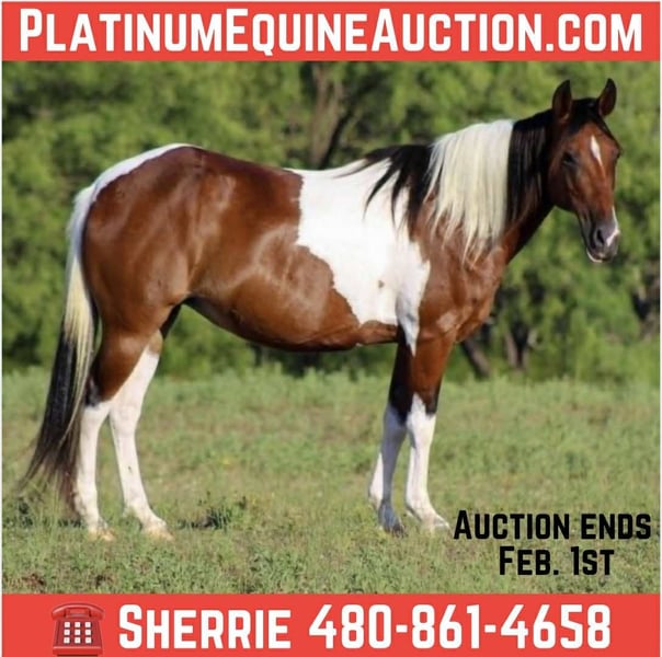 ONLINE AUCTION Place your bids at www.PlatinumEquineAuction.com Starting Bid $3500 Auction ends February 1st, 2026 Need a new saddle? Check out White Rock Saddles on our website or Facebook If you’re looking for a pony that’s not just beautiful but also kind, reliable, and fun for the whole family—you just found her. Meet Bella, a stunning 10-year-old paint pony mare standing at a perfect 13.2 hands tall. She’s that magical size—big enough for an adult to enjoy, yet perfectly suited for young kids just starting their riding journey. Bella has been a gentle and patient teacher for a 5-year-old beginner, and she takes care of her riders with a heart of gold. She’s the kind of pony that gives you confidence, never gets in a hurry, and always tries her best to please. Whether it’s a child learning to hold the reins or an adult wanting a relaxing trail ride, Bella adjusts to her rider and makes every ride a safe and enjoyable. Bella shines out on the trails—surefooted, steady, and unbothered by the unexpected. She’s been on camping trips, navigated wildlife, and is no stranger to cattle, pigs, dogs, or busy environments. She’s crossed tarps, bridges, logs, carried flags, and even strutted through the famous Fort Worth Stockyards without batting an eye. From casual play days to slow scenic trail rides, Bella is up for the adventure. While she’s not a speed demon, she’s always willing and happy to participate in fun events, learning new things, and being part of the action. On the ground, Bella is a doll. She has the best manners—easy to catch, groom, saddle, load, and handle. She stands tied, respects your space, and loves attention. She’s affectionate without being pushy, and has the kind of sweet, calm nature that makes her easy to fall in love with. Bella is truly a once-in-a-lifetime kind of pony. She’s got the looks, the experience, the temperament, and the heart to be someone’s forever best friend. Whether you’re searching for a first pony for a child, a trustworthy family horse, or a calm ride for yourself, Bella is ready to make memories with you. Don’t miss your chance to own a pony like Bella. Safe, seasoned, and sweet as can be—she’s the kind that doesn’t come around often. She will come with a current Coggins and health certificate to cross state lines. Call or Text Sherrie with Shadow of the Hawk Ranch, 480-861-4658. Located in Cave Creek, AZ. ONLINE AUCTION Place your bids at www.PlatinumEquineAuction.com Starting Bid $3500 Auction ends February 1st, 2026 Need a new saddle? Check out White Rock Saddles on our website or Facebook