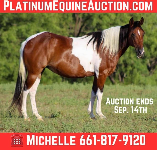 ONLINE AUCTION Place your bids at www.PlatinumEquineAuction.com Starting Bid $3500 Auction ends September 14th, 2025 Need a new saddle? Check out White Rock Saddles on our website or Facebook If you’re looking for a pony that’s not just beautiful but also kind, reliable, and fun for the whole family—you just found her. Meet Bella, a stunning 10-year-old paint pony mare standing at a perfect 13.2 hands tall. She’s that magical size—big enough for an adult to enjoy, yet perfectly suited for young kids just starting their riding journey. Bella has been a gentle and patient teacher for a 5-year-old beginner, and she takes care of her riders with a heart of gold. She’s the kind of pony that gives you confidence, never gets in a hurry, and always tries her best to please. Whether it’s a child learning to hold the reins or an adult wanting a relaxing trail ride, Bella adjusts to her rider and makes every ride a safe and enjoyable one. Bella shines out on the trails—surefooted, steady, and unbothered by the unexpected. She’s been on camping trips, navigated wildlife, and is no stranger to cattle, pigs, dogs, or busy environments. She’s crossed tarps, bridges, logs, carried flags, and even strutted through the famous Fort Worth Stockyards without batting an eye. From casual play days to slow scenic trail rides, Bella is up for the adventure. While she’s not a speed demon, she’s always willing and happy to participate in fun events, learning new things, and being part of the action. On the ground, Bella is a doll. She has the best manners—easy to catch, groom, saddle, load, and handle. She stands tied, respects your space, and loves attention. She’s affectionate without being pushy, and has the kind of sweet, calm nature that makes her easy to fall in love with. Bella is truly a once-in-a-lifetime kind of pony. She’s got the looks, the experience, the temperament, and the heart to be someone’s forever best friend. Whether you’re searching for a first pony for a child, a trustworthy family horse, or a calm ride for yourself—Bella is ready to make memories with you. Don’t miss your chance to own a pony like Bella. Safe, seasoned, and sweet as can be—she’s the kind that doesn’t come around often. She will come with a current coggins and health certificate to cross state lines. She just got a fresh set of shoes also. Come meet Bella in person—or if you’re not local, schedule a FaceTime showing! Call or Text Michelle with M $ Performance Horses 661-817-9120 Transportation? We’ve got you covered! We work with trusted haulers worldwide and can help arrange safe delivery to: • Anywhere in the U.S. • Canada • Mexico • Hawaii • Alaska …and anywhere in between ONLINE AUCTION Place your bids at www.PlatinumEquineAuction.com Starting Bid $3500 Auction ends September 14th, 2025 Need a new saddle? Check out White Rock Saddles on our website or Facebook