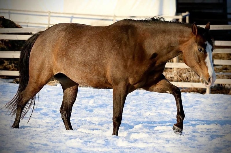 Eljana Chex ist eine bildhübsche Quarter Horse Stute, geboren im Jahr 2013. Sie überzeugt durch ihre besondere Farbe Bay Sabino mit feinen Stichelhaaren und ihr kompaktes, korrekt gebautes Exterieur bei einem Stockmaß von ca. 147 cm. Genetisch ist sie selbstverständlich 5-Panel n/n getestet. Charakterlich zeigt sich Eljana Chex äußerst angenehm. Sie ist lieb, menschenbezogen und jederzeit freundlich im Umgang. Durch ihre ruhige und unkomplizierte Art ist sie einfach zu händeln und im täglichen Umgang sehr angenehm. Sie ist bestens im Alltag integriert, kennt Hufschmied und Tierarzt, steht problemlos in der Herde und ist ebenso mit der Boxenhaltung vertraut. Als Zuchtstute überzeugt sie auf ganzer Linie. Eljana Chex ist eine zuverlässige Mutterstute, die Fohlen in sehr guter Qualität bringt. Ihre Nachkommen sind groß, kräftig und zeichnen sich besonders durch ihre Verlässlichkeit aus - echte Verlasspferde mit hervorragendem Charakter. Aktuell ist sie tragend für den 17. Mai 2026 von MS Gunners Cashflow, einem homozygoten Splash 1 Hengst. Eljana Chex wurde geritten und zeigt sich auch unter dem Sattel sowie im Gelände als absolut verlässliches Pferd. Sie wird jedoch ausschließlich als Zuchtstute abgegeben. Mit ihrer erstklassigen Reining-Abstammung (Topsail Flashy Jac x Ima Reinman) ist sie ein echtes Juwel für die Zucht und eine wertvolle Bereicherung für jeden Zuchtbestand. Beim Transport kann gerne unterstützt werden.