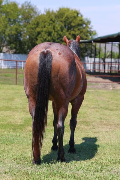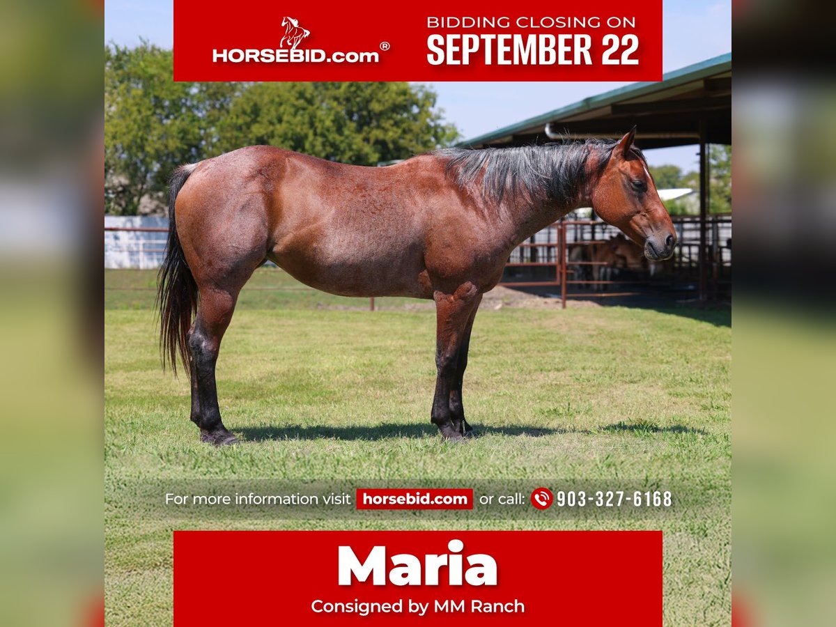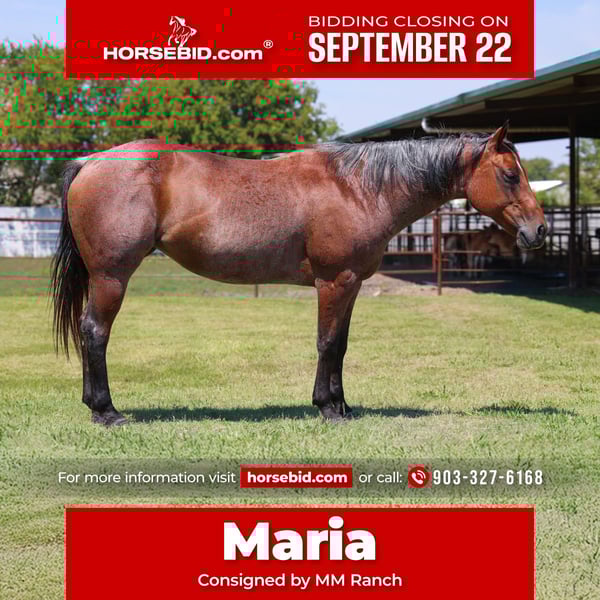 🍁𝒕𝒉𝒆 𝐅𝐀𝐋𝐋 𝑺𝒑𝒆𝒄𝒕𝒂𝒄𝒖𝒍𝒂𝒓🍁 Happening now thru MONDAY | SEPTEMBER 22nd - Available EXCLUSIVELY on HorseBid's website! For more details and to register visit: www.Horsebid.com CONSIGNOR CONTACT: MM Ranch 903-327-6168 LOCATION: Forney, TX BREED: Quarter horse REGISTERED: No REGISTERED NAME: Maria COLOR: Bay Roan HEIGHT: 14.3 AGE: 13 GENDER: Mare Maria is a well trained all around horse for the whole family. She is 13 years old and 14.3 hands tall. She has the color, look and best of all, she has the sweetest temperament. She is as BOMBPROOF as they get. She is one we catch to do any job or event no matter how long she has been turned out and we can always trust knowing she’ll be the same level headed gentle and safe horse every time. She is the kid’s favorite pick not just because of her color but because of how endlessly tolerant and good she is with them. She is always up for an adventure and never fails to do what is asked of her. She has the sweetest ground manners and genuinely loves people and wants to be around you. She will one hand neck rein, backs with easy, has a very good short lope, very smooth, will ride on a loose rein and is easy to maneuver for any age rider. She will NOT buck, bite or kick and she has no bad habits. She stands patient and quiet for getting on and off her back with/without a mounting block. You can carry the flag on her, she will go over tarps and small jumps. She will do all the playday events at a walk, trot or lope. She has been rode by traffic, around dogs, down gravel roads through the ditches. She is a very easy keeper, can ride her anywhere, can ride her bareback with just a halter on, can open and close gates on her, she will cross water, can ride in any terrain. If you are looking for a SAFE, RELIABLE horse for family horse that can do it all from trail riding or ranch work or babysitting the kids this is your girl. She will take care of anyone who crawls on her back no matter their age. She has been rode countless miles on trails through the mountains and wooded pastures. She will ride out alone and keep you safe if you enjoy independent trails or does great in a group setting too. She is the sweetest mare and to know her is to love her. We will help arrange affordable shipping, if needed.