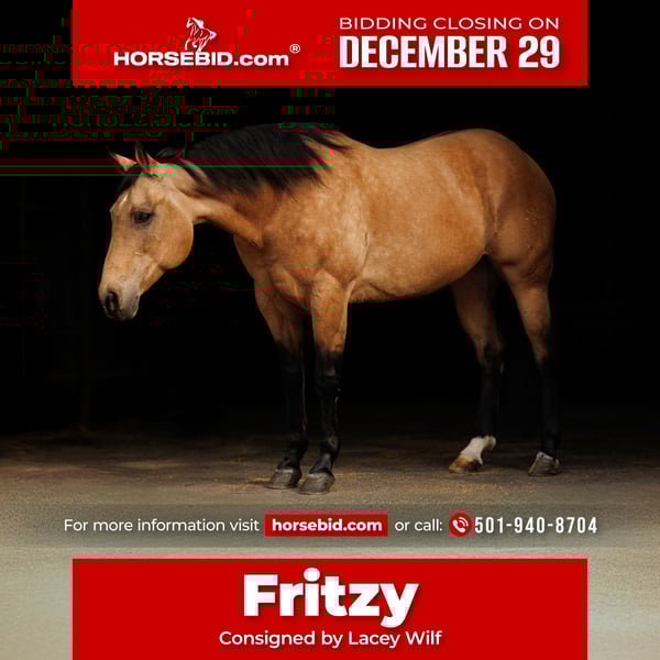 ⚜️ 𝓗𝓮𝓻𝓲𝓽𝓪𝓰𝓮 𝐖𝐢𝐧𝐭𝐞𝐫 𝓒𝓵𝓪𝓼𝓼𝓲𝓬⚜️ Happening now thru MONDAY | DECEMBER 29th - Available EXCLUSIVELY on HorseBid's website! For more details and to register visit: www.Horsebid.com CONSIGNOR CONTACT: Lacey Wilf 501-940-8704 LOCATION: Quitman, AR BREED: Quarter Horse REGISTERED: Yes REGISTERED NAME: Fritzy Slidin Solano COLOR: Buckskin HEIGHT: 15 AGE: 13 GENDER: Mare Fritzy Slidin Solano, affectionately known as Fritzy, is a 2012 AQHA mare standing a handy 15 hands, and she is the kind that makes you smile every time you swing a leg over. Stylish, confident, and effortlessly capable, she blends finished performance with a composed, gentle mind—wrapped up in a beautifully made package. Fritzy is a finished barrel horse with a solid, honest handle and the kind of consistency everyone looks for. She is truly the same mare every ride, even with time off—no surprises, no theatrics, just step on and go. She has extensive experience at the stockyards and out on the trail, where she proves her level-headed nature time and time again. Traffic, noise, new environments, and everyday chaos doesn’t bother her; she takes everything in stride with quiet confidence. On the ground, Fritzy is a standout. She has excellent manners, is easy to catch, polite to tack, and a pleasure to be around. Gentle to her core, she’s the kind that meets every situation with a calm eye and a willing attitude, making her enjoyable for a wide range of riders. She’s also easy on the eyes. Fritzy is well made with good bone, balance, and shape, the kind of mare that looks athletic and correct from every angle. Her pedigree speaks for itself, backed by proven bloodlines that add depth to her performance résumé and make her an exciting broodmare prospect when the time comes. She has clean, current front-end X-rays available for review. Finished, fancy, gentle, and cool as they come—Fritzy is the rare mare that brings ability, brains, beauty, and pedigree together in one very boujee package.