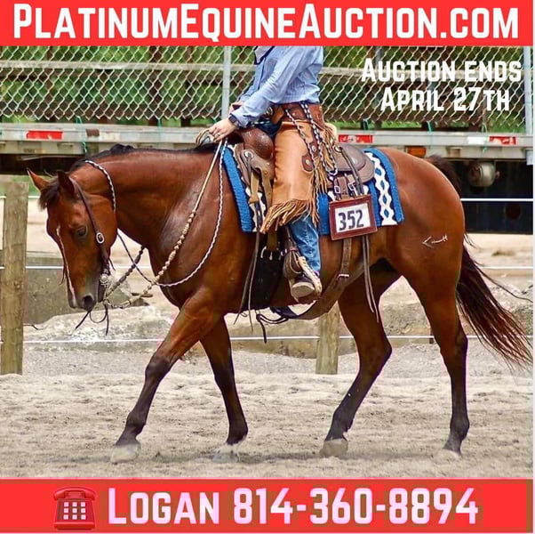 ONLINE AUCTION Place your bids at www.PlatinumEquineAuction.com Starting Bid $3500 Auction ends April 27th, 2025 Need a new saddle? Check out White Rock Saddles on our website or Facebook! Badger Lil Zipper aka Selah is a 14 year old 14.2hh mare. Selah is a horse that absolutely eats the show ring up. Selah is a finished ranch horse and ready to go back to the ring. Selah has earned some money, saddles, buckles. You name it and she’s won it. Selah has been owned and shown by a beginner ranch rider who unfortunately is just not wanting to show anymore so it’s time for Selah to shine with her next person. In the ring she knows her job. She will take both leads, drop her head, side pass, spin in a circle both ways, and will lope right off. Not only does she have a beautiful extended trot her lope is very well put together and beautiful as well. Selah knows all the seat commands and is spur broke. She does also do fantastic in the trail classes as well. When she had her beginner ranch rider showing her, she took second in her class out of an amazing group of horses. Selah is the type of horse you just get on and sit there and let her do her job! Selah also looks beautiful under an English saddle. She will take a jump as well when asked. She has also carried a flag and it has not bothered her at all. Not much phases this pretty girl. But, Selah will also take the day off and go out on a trail like a boss! She is all around an amazing horse. You can let her sit and pull her out and she is the same horse every time, ready to please you! She does have an old scar on her back leg, does not bother her what so ever and would be happy to explain what happened to anyone who would like to know. She requires absolutely no maintenance, stays fat on air and is built right! Don’t miss out on this pretty girl and let Selah take you back to the show ring to get you those ribbons! Located in Rineyville Kentucky. Contact Logan at 814-360-8894 with any questions. ONLINE AUCTION Place your bids at www.PlatinumEquineAuction.com Starting Bid $3500 Auction ends April 27th, 2025 Need a new saddle? Check out White Rock Saddles on our website or Facebook!