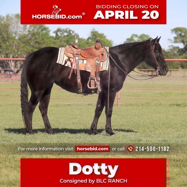 ⚜️𝐭𝐡𝐞 𝓔𝓵𝓲𝓽𝓮 𝐒𝐩𝐫𝐢𝐧𝐠 𝐂𝐥𝐚𝐬𝐬𝐢𝐜⚜️ Happening now thru MONDAY | APRIL 20th - Available EXCLUSIVELY on HorseBid's website! For more details and to register visit: www.Horsebid.com CONSIGNOR CONTACT: BLC RANCH Brett Clark 214-500-1182 LOCATION: Grand Saline, TX BREED: Quarter REGISTERED: Yes REGISTERED NAME: Jazshollywoodsparkle COLOR: Black HEIGHT: 15 AGE: 15 GENDER: Mare Everyone meet Dotty. She stand 15 hands and weighs 1150 pounds. The perfect size for all riders. Dotty was started out the right way of training and has been shown in reining pen. Dotty is extremely user friendly , she has all the buttons but is also simple enough for the beginners to ride and learn on. If you can sit in the saddle you can ride her. She would be great for ranch riding or a novice reining candidate. Dotty is not limited to reining she is a great partner for trail riding and someone just wanting an enjoyable mount. Handling her is a breeze, from catching her in the pasture or on the wash rack. Loads with ease and stands for the farrier. Dotty is a horse that fits everybody. She is very broke and is going to do whatever you ask. Don’t miss this pretty black mare. Please call 214-500-1182 let’s talk about her.