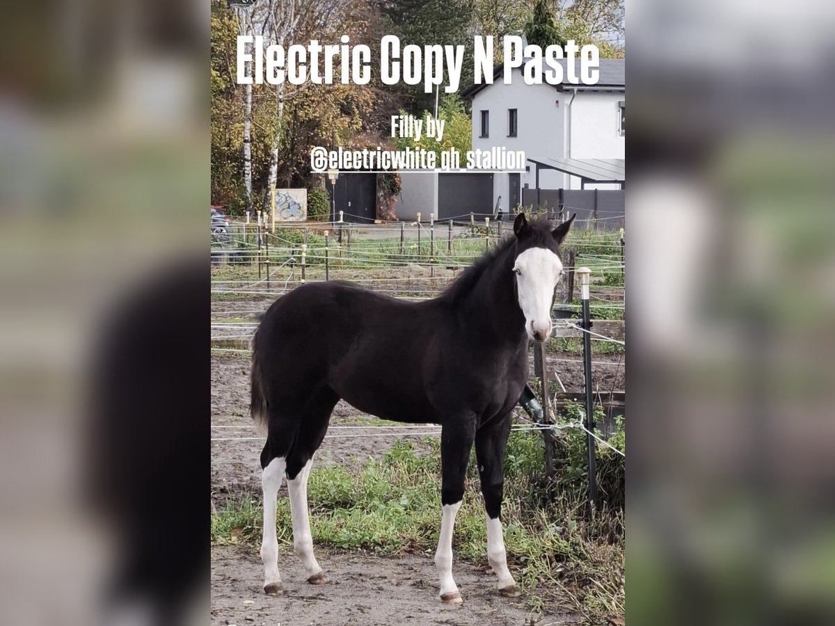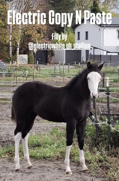 For sale is our beautiful Electric CopyNPaste, affectionately called Peppels, in a special Smoky Black coat and with an outstanding reining pedigree. Peppels is a real eye-catcher. She simply cannot deny her sire, Electric White. She impresses not only with her stunning color, beautiful markings, and bright blue eyes but also with her correct conformation and expressive movement. Peppels is very curious, affectionate, and attentive, yet she remains very calm. She is familiar with the foal basics and has been regularly dewormed. Of course, Peppels has a DQHA passport and the American registration papers. She is 5-panel N/N through her parents. Peppels has everything you could wish for in a successful future in reining sport and a reliable leisure partner. The price reflects her quality. We look forward to getting to know you. Peppels is available along with other foals. Feel free to contact us by phone as well: 015775300678