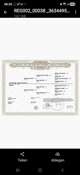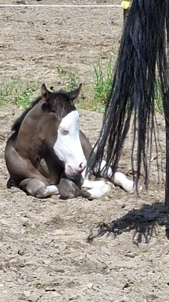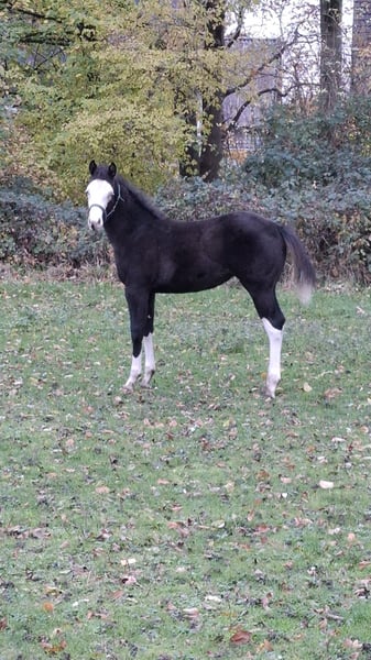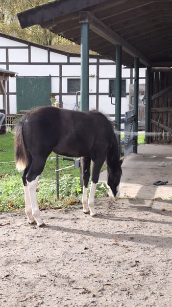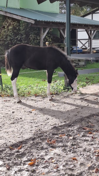 Zum Verkauf steht unsere wunderschöne Electric CopyNPaste aka Peppels in Sonderlackierung Smokyblack und einem Reining Pedigree vom Feinsten. Peppels ist ein echter Hingucker. Sie kann ihre Vater Eletric White einfach nicht verleugnen. Sie überzeugt nicht nur mit ihrer tollen Farbe, wunderschönen Abzeichen und den strahlend blauen Augen sondern auch mit ihrem korrekten Körperbau und ausdrucksstarken Bewegungen. Peppels ist sehr neugierig, verschmust und aufmerksam, bleibt aber trotzdem sehr cool dabei. Sie kennt das Fohlen ABC und ist regelmäßig entwurmt worden. Selbstverständlich hat Peppels einen DQHA Pass und das amerikanische Papier. Sie ist 5 Panel N/N über ihre Eltern. Peppels bringt alles mit, was man sich für eine erfolgreiche Zukunft im Reining Sport und zuverlässigen Freizeitpartner wünscht. Der Preis ist der Qualität entsprechend. Gerne freuen wir uns auf ein Kennenlernen. Peppels steht mit weiteren Fohlen zusammen. Melden Sie sich gern auch telefonisch 015775300678