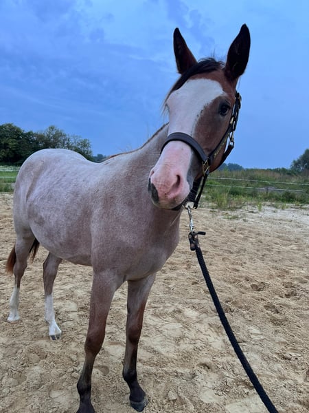 Boons Shining River ist eine junge Quarter Horse Stute mit Half-Quarter Horse Papieren, geboren am 23.04.2024. Sie hat die Farbe Bay Roan Overo, ist aktuell etwa 149 cm groß und wird voraussichtlich ein Endmaß von mindestens 155 cm erreichen. Sie überzeugt durch ihren harmonischen Körperbau, korrekte Stellung und vielversprechende Proportionen und ist ein echter Eyecatcher. Neben ihrer ansprechenden Optik besticht sie vor allem durch ihren lieben, menschenbezogenen Charakter. Die Stute ist ruhig, entspannt und aufgeschlossen, besitzt ein sanftes und freundliches Wesen, ist brav im Umgang, unkompliziert und lernt sehr schnell. Boons Shining River ist gut erzogen und zeigt sich im täglichen Umgang stets angenehm. Die Stute ist gesund, altersgemäß geimpft und entwurmt. Sie kennt die Box mit Weidehaltung und wächst unter besten Bedingungen in Ruhe auf. Ihre Versorgung erfolgt mit hochwertigem Aufzuchtsfutter und guten Mineralstoffen, was ihre Entwicklung optimal unterstützt. In ihrer bisherigen Ausbildung kennt sie bereits das Fohlen-ABC, geht als Handpferd mit ins Gelände, lässt sich problemlos verladen und fährt Anhänger. Sie ist den Umgang mit Menschen und verschiedene Alltagssituationen gewöhnt. Väterlicherseits verfügt sie über eine gute Cuttingabstammung (Vater: Redwhiteandblue Boon), kombiniert mit sehr guten Reiteigenschaften von der mütterlichen Seite. Dadurch eignet sie sich sowohl für den Sport- und Turnierbereich als auch für den Freizeitbereich. Boons Shining River ist ein junges Pferd mit Herz und Zukunft und ideal für jemanden, der ein Jungpferd von Beginn an begleiten, fördern und eine echte Partnerschaft aufbauen möchte. Sie ist ein vielversprechendes Nachwuchspferd für ambitionierte Reiterinnen und Reiter ebenso wie für liebevolle Freizeitreiter.