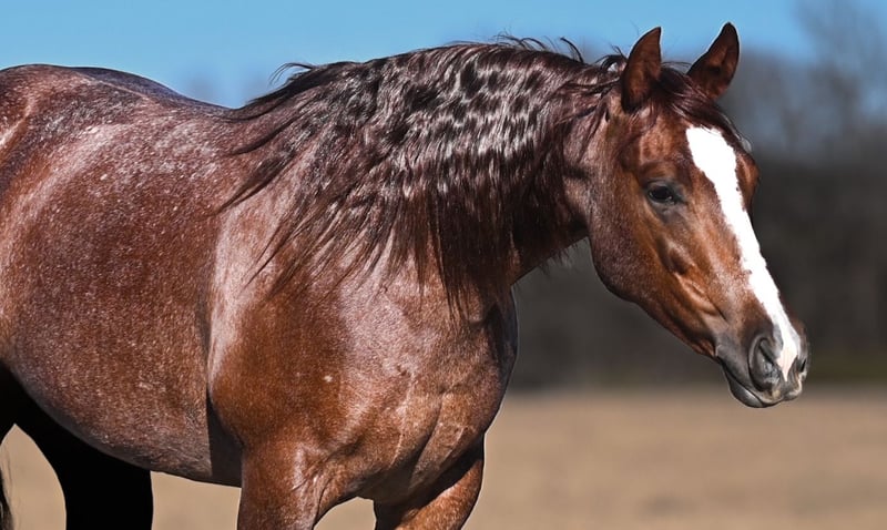 Margo, 3 jaar oud, 1,55 m, rood-roan AQHA merrie