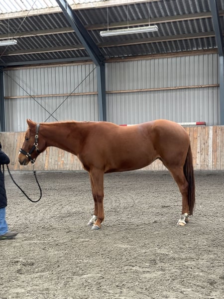 “Andrea,” *Better Call Me Baby*, is a promising AQHA mare born in May 2023 with great potential. She was bred under the DKQHA QSP program and is sired by Good Better Best, whose offspring dominate the hunter classes in the USA. Andrea currently measures approximately 160 cm and is expected to reach a height of around 165 cm. She was purchased at 6 months old and has been handled daily ever since. Andrea is very quick to learn and works well on the lunge, where she already has a solid foundation. In addition, she has begun basic showmanship training, including setup and turns. Backing and preparation for it have not yet been started due to pregnancy. She has been well cared for in every way, including dental care, vaccinations, and farrier visits, and is currently barefoot. Andrea is accustomed to living outside 24/7 during the summer months. In daily handling, Andrea is easy and uncomplicated despite being in her teenage phase. She clearly shows all-around potential, but also has strong breeding potential for hunter classes with her beautiful, long, and expressive gaits. Andrea is only for sale due to lack of time.