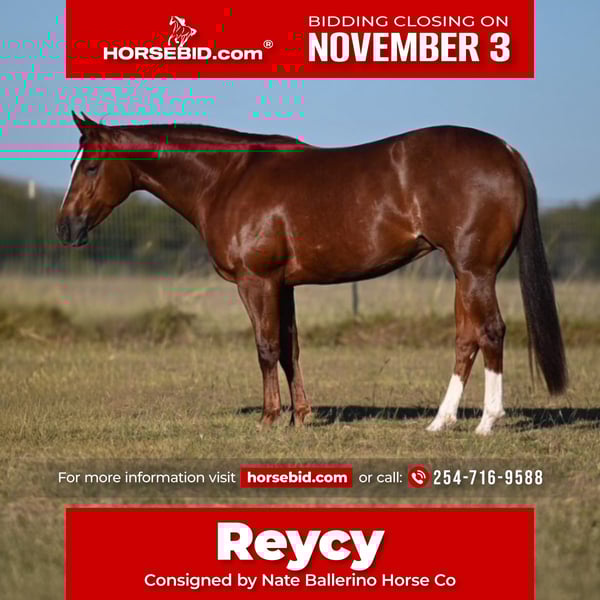⚜️𝐓𝐇𝐄 𝐅𝐀𝐋𝐋 𝐇𝐄𝐑𝐈𝐓𝐀𝐆𝐄 𝐂𝐋𝐀𝐒𝐒𝐈𝐂⚜️ Happening now thru MONDAY | NOVEMBER 3rd - Available EXCLUSIVELY on HorseBid's website! For more details and to register visit: www.Horsebid.com CONSIGNOR CONTACT: Nate Ballerino Horse Co 254-716-9588 LOCATION: Waco TX BREED: AQHA REGISTERED: Yes REGISTERED NAME: REYCY ANIMAL COLOR: Sorrel HEIGHT: 14.2 AGE: 3 GENDER: Mare 3-Year-Old Mare by THE ANIMAL ($146,000+ LTE) out of a High Brow Cat Mare This filly has the pedigree, foundation, and mindset to go win. She’s by THE ANIMAL ($146,000+ LTE) and out of a High Brow Cat mare, giving her all the cow and style you could ask for. She’s been in a cow horse program for 6 months, knows all the maneuvers, and has a ton of feel and natural sense on a cow. Quiet, kind, and consistent — she’s gentle and the same every day. Would excel as a heel horse or breakaway prospect, with the look and ability to go show or rope on. Good to tie, bathe, shoe, and haul. She’s Riata Buckle, Royal Crown, and Gold Buckle eligible — making her the complete package for someone who wants to be competitive and enjoy one that’s broke and classy. Bred right. Built right. Ready to go win.
