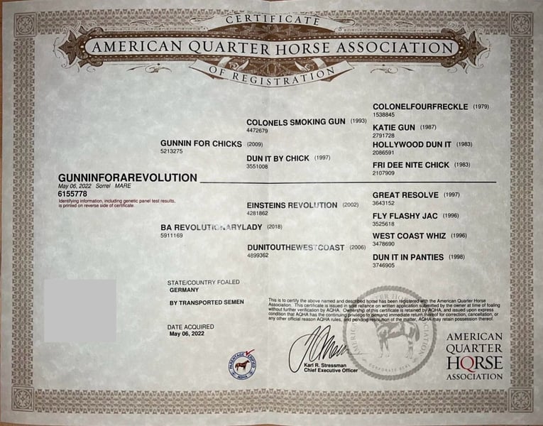 ❗️OFFERED FOR YOUR CONSIDERATION❗️ ⭐️GunninForARevolution⭐️ GunninForARevolution ist eine 2022 geborene AQHA & APHA Stute, sie ist ein absoluter eye catcher mit viel Behang und Schweif. Sie ist NRHA Germany und NRHA European einbezahlt. Elli zeigt sich sehr talentiert in allen Manövern und hat eine ihrem Alter gerechte Reiningausbildung. Durch ihre einfache Trainierbarkeit eignet sie sich auch sehr für den ambitionierten Non Pro Reiter. Eine einwandfreie AKU ist vorhanden. Durch ihr herausragendes Pedigree wird sie für die Zucht sehr wertvoll sein. Dam: BA Revolutionarylady ist eine direkte Tochter von $2M NRHA Hengst Einsteins Revolution, ihre Mutter hat bereits PE von mehr als $3,000 in NRHA & NRCHA Sire: Gunnin for Chicks (LTE > $100.00) (Seine Mutter produzierte bereits +600.000$ PE) Bei Interesse dürfen Sie uns gerne kontaktieren. 0173/7164511 0171/6840395 GunninForARevolution GunninForARevolution is a 2022 AQHA & APHA mare, an absolute eye-catcher with a lot of mane and tail. She is enrolled in NRHA Germany and NRHA Europe. Elli shows great talent in all maneuvers and has an age-appropriate reining training. Due to her easy trainability, she is also very suitable for an ambitious Non-Pro rider. A perfect pre-purchase exam (AKU) is available. Thanks to her outstanding pedigree, she will also be highly valuable for breeding. Dam: BA Revolutionarylady is a direct daughter of $2M NRHA sire Einsteins Revolution, her mother has PE of more than $3,000 in NRHA & NRCHA Sire: Gunnin for Chicks (LTE > $100,000) (His mother produced +600.000$ PE) If interested, contact us at: 0173/7164511 0171/6840395