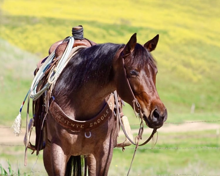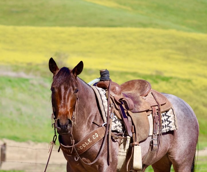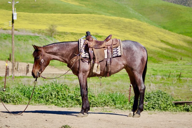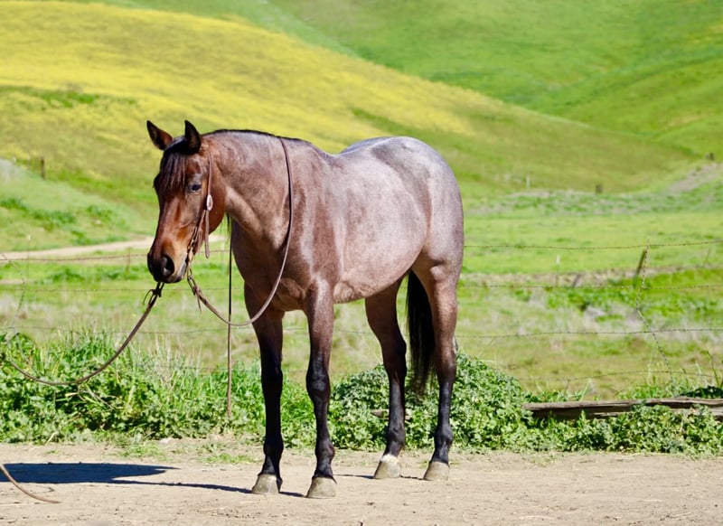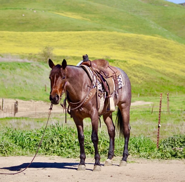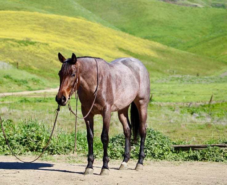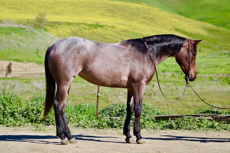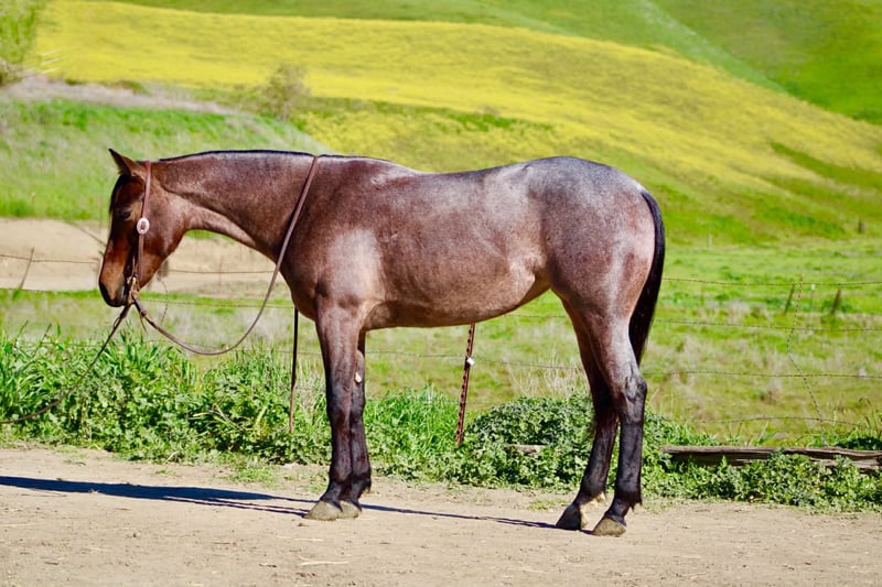 "AVAILABLE ON ONLINE HORSE AUCTION AT www DOT PlatinumEquineAuction DOT com BIDDING OPEN NOW thru SUNDAY | FEBRUARY 22ND! *Final price will be determined on auction site* CONSIGNOR CONTACT INFO: Longhorn Ranch 831-537-1915 LOCATION: Paicines, CA Annie Oakley Roan Mare • 4 Years Old • 15 Hands Annie Oakley is what happens when natural beauty, good training, and a standout mind all land in the same horse. She is talented, genuine, and enjoyable in a way that is immediately apparent — a mare that feels good to sit on, easy to understand, and rewarding to ride. Her rich roan coat, frosted mane and tail, and balanced build make her eye-catching, but her real value shows up when you swing a leg over. For a four-year-old, Annie Oakley is remarkably broke and educated. She rides soft, stays correct through her body, and carries herself with purpose. She bends and shapes willingly, lopes around with a smooth, easy rhythm, and offers a nice sliding stop and a stylish turnaround. She feels steady, confident, and far along for her age. Annie Oakley has a good head on her shoulders. She is gentle, kind, and honest, with a natural desire to do right by her rider. She is safe for a variety of rider levels and adjusts easily to who is in the saddle. She meets you at the gate, drops her head for the bridle, and goes to work with a willing attitude. She is the kind that makes riding simple and enjoyable. She has been tracking cattle, shows a lot of interest, and has already been gathering. Annie Oakley displays plenty of natural cow sense and feels like a mare that will continue to excel with cattle work as she goes forward. She is well exposed and seasoned beyond her years. Bridges, tarps, pool noodles, and obstacle courses are all handled quietly. New places and new tasks are met with curiosity and composure. Out on the trail, Annie Oakley is steady and sure-footed. She travels through hills, crosses water, and handles wildlife and changing scenery with ease. She is just as enjoyable outside the arena as she is inside it. She is good in traffic, stands tied quietly, clips easily, is good for the farrier, hauls well, and does well in both a stall and pasture. Annie Oakley is the kind that earns her keep. The kind that gets ridden first. The kind you build a program around. A truly special young mare with a bright future ahead of her. Longhorn Ranch Paicines, California Dina – 831-537-1915 Shipping is available anywhere we have reputable haulers to help get your new horse safely to your doorstep.