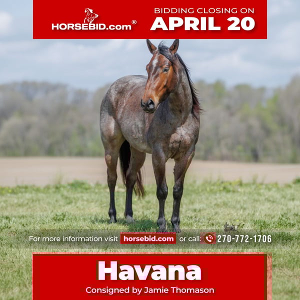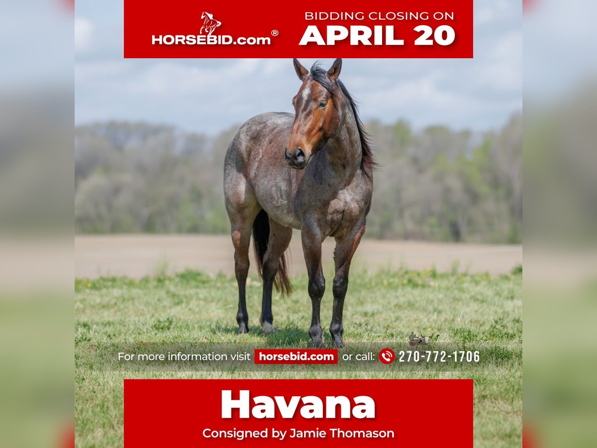 ⚜️𝐭𝐡𝐞 𝓔𝓵𝓲𝓽𝓮 𝐒𝐩𝐫𝐢𝐧𝐠 𝐂𝐥𝐚𝐬𝐬𝐢𝐜⚜️ Happening now thru MONDAY | APRIL 20th - Available EXCLUSIVELY on HorseBid's website! For more details and to register visit: www.Horsebid.com CONSIGNOR CONTACT: Jamie Thomason 270-772-1706 LOCATION: Auburn, KY BREED: Quarter Horse REGISTERED: Yes REGISTERED NAME: LC WHISKEY GYPSY 502 COLOR: Bay Roan HEIGHT: 15 AGE: 4 GENDER: Mare Calm, quiet, and gentle by nature, Havana is the kind of mare everyone hopes to find, but few come across. Dependable on the ranch, confident and seasoned on the trail, and trustworthy enough for non-horsey guests, she offers the total package. Havana is a 4-year-old bay roan, AQHA mare, standing a handy 15 hands. Havana lives and works on a working cattle operation, so she’s truly been there and done that. She’s sorted and penned cattle alongside stock dogs, opened and closed gates, doctored calves in the pasture, and has been started on the head side out of the box. She takes everything in stride, showing maturity beyond her years and a strong work ethic that makes her a valuable partner on the ranch. Out on the trail, Havana is just as reliable. She’s carried visitors of various experience levels. She stays laid back and level-headed, never picking up the pace unless asked. She crosses water, navigates downfall, handles steep inclines, and remains surefooted through rough terrain. Whether riding out alone or in a group, she stays confident and steady, making every ride enjoyable. She’s as easy to own as they come. Easy to catch, stands quietly for grooming and saddling, and is simple to load and haul. Havana stalls well or can be turned out in a mixed herd. If you’re looking for a gorgeous, versatile mare with real-world experience and a trustworthy nature, Havana is one you won’t want to miss. Havana sells current on all cares. We can assist in arranging transport to anywhere! If you have any other questions or would like to meet Havana in person, feel free to reach out!