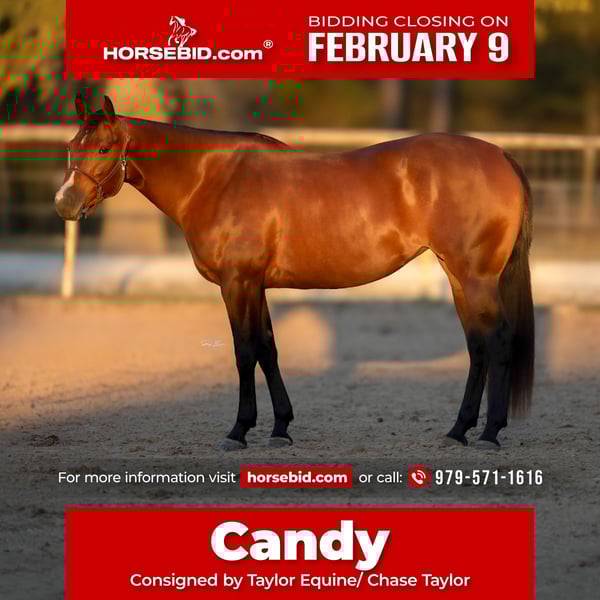 ❤️🔥𝑩𝒆 𝑴𝒊𝒏𝒆 𝐒𝐄𝐋𝐄𝐂𝐓❤️🔥 Happening now thru MONDAY | FEBRUARY 9th - Available EXCLUSIVELY on HorseBid's website! For more details and to register visit: www.Horsebid.com CONSIGNOR CONTACT: Taylor Equine/ Chase Taylor 979-571-1616 LOCATION: Huntsville, TX BREED: Quarter Horse REGISTERED: Yes REGISTERED NAME: SONITALENA HOLLYWOOD COLOR: Bay HEIGHT: 15.1 AGE: 4 GENDER: Mare Candy is an eye-catching bay mare with the athletic build, and ability to stand out in any performance setting. She has a full year of professional reining cow horse training and has been proven outside with long days of ranch work. Candy has been hauled to four ranch sorting competitions and earned four wins, consistently showcasing a strong read on cattle, quick footwork, and natural cow sense. She has been started on the head side and is showing excellent potential to develop into a solid, competitive head horse. Honest, willing, and versatile, Candy is the kind that goes to work every time you swing a leg over her and stays reliable even with time off. Whether you’re looking for a dependable ranch mount, or a performance prospect for the arena, Candy has the talent, training, and mindset to excel!