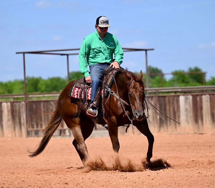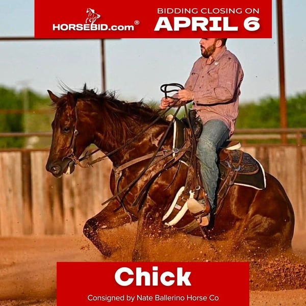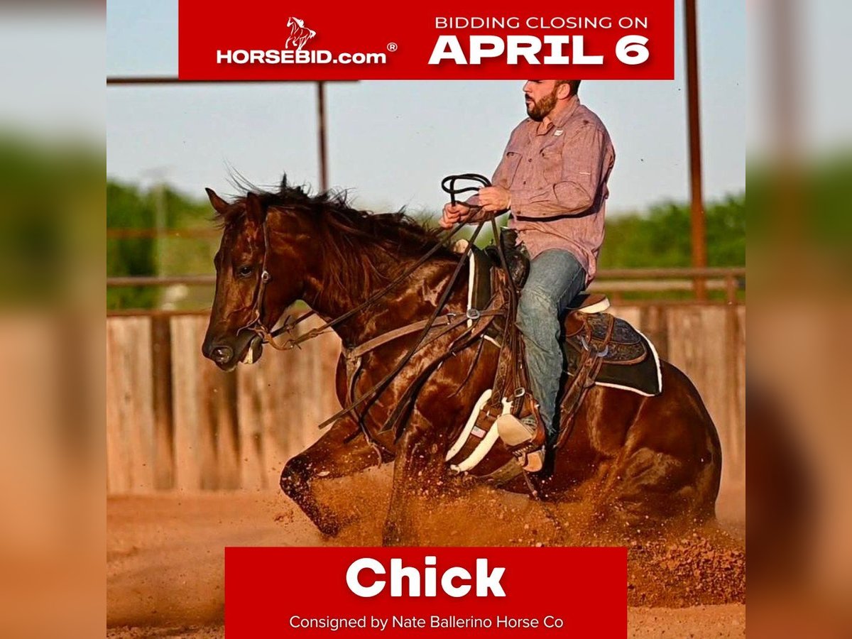 🌟𝑨𝒑𝒓𝒊𝒍 𝐀𝐋𝐋 𝐒𝐓𝐀𝐑 𝐋𝐈𝐍𝐄𝐔𝐏🌟 Happening now thru MONDAY | APRIL 6th - Available EXCLUSIVELY on HorseBid's website! For more details and to register visit: www.Horsebid.com CONSIGNOR CONTACT: Nate Ballerino Horse Co 254-716-9588 LOCATION: Waco,TX BREED: QH REGISTERED: Yes REGISTERED NAME: Night Sailing Chick COLOR: Sorrel HEIGHT: 15.1 AGE: 4 GENDER: Mare This Late Night Stopper mare was trained in a reining program and knows all of her maneuvers. She’s broke, handy, and stand 15.1 hands. She’s got the size, the handle, and the kind of foundation that makes her easy to go use. She’s the kind you can ride now and breed later, with the ability to be useful today and valuable down the road. Please Call Nate Ballerino at 254-716-9588 with any questions. Nation wide shipping can be arranged.