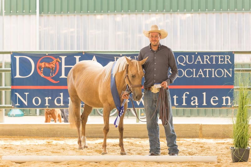 MP Shome Boom Boom Great Palomino mare from the successful stallion USS N DUN IT (Elias Ernst - Ernst Performance Horses) out of a Jacs Great Spirit/Hollywood Cody Jac/Reed Joe Hancock mare. There isn't much to say about the father's successes: he has just recently become World Champion again in 2025 at the age of 20! The mother has been successfully shown in both Reining and Ranch classes. She is now also successful in Working Equitation. MP Shome Boom Boom herself has been very gently trained. She is well-grounded and a total buddy mare. The maneuvers have been introduced but not fully trained. She shows great talent. In 2023, the mare secured 3 Futurity Champion titles. In 2024, at her first show under saddle, she achieved 3rd place (Bronze) in the Ranch Riding Futurity. This year, she was spontaneously shown in a Class A Working Equitation and secured 6th place. At her age, MP Shome Boom Boom is a reliable horse. She is well-behaved in the arena, on the flat, in the field, and on the road. Even after longer breaks without long warm-up - just get on, ride off, and come home safely. She trailers well alone or with others. She is easy to handle, at the farrier, etc. MP Shome Boom Boom has some cattle experience and is equipped with good awareness and pleasant motivation. She is not fearful or hesitant. Riding without a saddle? Kids owning her? No problem for this wonderful mare. MP Shome Boom Boom is bred by us and should be used as a young competition horse. Unfortunately, at 145 cm, she is too small for a 2-meter tall man in the long run - therefore, we are parting with this gem. We are truly looking for a suitable forever home for her. With us, she is unfortunately quite "underutilized" and receives significantly too little attention. This is not an urgent sale or anything - the perfect place is more important to us than the final price. Location: NRW near Cologne For more information, preferably by phone/WhatsApp at 01755662622