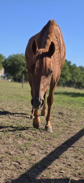 Very sweet and beautiful mare, born in 2021, sired by a cutting stallion (Woodys Time) and out of a reining/all-round mare (Arcchicca). She has begun training in cutting and is familiar with trail riding; she is so well-behaved that a child can walk with her. She is very eager to learn and enjoys working. She is available for sale due to her upcoming start as a self-bred young horse. Feel free to contact us for more information.