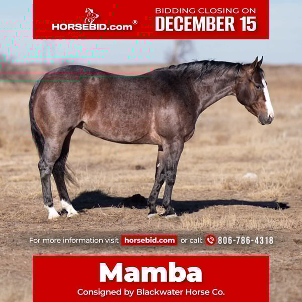 🎄𝐓𝐇𝐄 𝑯𝒐𝒍𝒊𝒅𝒂𝒚 𝐂𝐋𝐀𝐒𝐒𝐈𝐂🎄 Happening now thru MONDAY | DECEMBER 15th - Available EXCLUSIVELY on HorseBid's website! For more details and to register visit: www.Horsebid.com CONSIGNOR CONTACT: Blackwater Horse Co. 806-786-4318 LOCATION: Canyon TX BREED: AQHA REGISTERED: Yes REGISTERED NAME: Black Market Gucci COLOR: Bay Roan HEIGHT: 14.3 AGE: 4 GENDER: Mare Mamba is a drop-dead gorgeous roan mare with the kind of presence that turns heads everywhere she goes. She’s exceptionally well bred, and it shows in every step she takes. Built correct and balanced, she carries herself with a natural elegance that makes her a standout the moment she enters the arena. Mamba rides around collected, stays between the reins, and feels smooth and honest every ride. She’s the kind of mare you can trust to stay consistent, whether she’s being tuned on, asked to step up, or just cruised around for an easy day. Even though this is a young mare, she’s got the mindset of a mature gelding. She does excellent with time off, whether she is turned out or in a stall, saddle her up and lope off with no problems. This mare is 100% sound to breed as well! Use her for a few years and then get a gorgeous colt out of her! With her size and color she will throw some flashy offspring. A beautiful, fluid mover, she floats across the ground with cadence and reach, making her a natural fit for anything from the show pen, to ranch versatility, to a classy using horse. She has been hauled to the local reining clinics and would be a great candidate for the VRH classes. Her talent is matched by a willing, level-headed mindset that makes her a pleasure to ride for all types of riders. Mamba has been exposed to all sorts of elements whether it be trail riding in the Palo Duro Canyon , or riding down the Canadian River Crossing water , logs or brush this mare has been there done that . We have been roping slow steers on her in the arena and she is showing lots of potential in every event . This is the type of mare that is just simply easy ! If you are looking for an all around mare to ride and raise one heck of a colt in the up coming years please come take a look at her ! Mamba is the complete package — looks, brains, breeding, and ability — and the kind you don’t come across often. Please call 📞 Tanner @ 806-786-4318