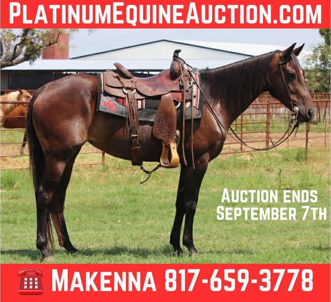 ONLINE AUCTION Place your bids at www.PlatinumEquineAuction.com Starting Bid $3500 Auction ends September 7th, 2025 Need a new saddle? Check out White Rock Saddles on our website or Facebook Meet Freya, a 5-year-old registered AQHA bay mare who is as gentle and kind as they come. If you’re searching for a horse that’s safe, fun, and versatile, this is the one. Freya is absolutely gentle for anyone who can sit in the saddle—she has that rare, steady mind that makes her a joy for riders of all levels. On the trails, Freya is a willing and confident partner. She’s surefooted, steady, and enjoys exploring new country whether she’s leading or following. She doesn’t get rattled easily and makes every ride a relaxing, enjoyable experience. In the arena, she’s a beautiful mover with smooth, easy gaits and a natural presence that makes her a standout. She’s soft in the bridle, responsive to her cues, and always aims to please. Freya has been ridden both English and Western, giving her a well-rounded foundation. Whether you’re looking for a dependable trail horse, a fun arena partner, or something with the versatility to go in many directions—she’s ready for the job. At only 5 years old, she has her whole life ahead of her, yet she already carries herself with the calm maturity of a seasoned horse. She’s not just safe—she’s enjoyable, the kind that makes you look forward to saddling up every time. Horses like Freya don’t come around every day. 📌 Registered AQHA 📌 5 years old 📌 Bay mare 📌 “Anyone can ride” gentle 📌 Rides English & Western 📌 Solid and fun on the trails 📌 Gorgeous mover in the arena Freya is the kind of horse you can build a future around—beautiful, trustworthy, and endlessly enjoyable. Don’t miss the chance to make her part of your barn. We are located in Lipan, TX. We have reputable haulers that go all over the country, including Hawaii and Canada. Give me a call or text and I’d be happy to answer any questions! Makenna Hartzell 817-659-3778. ONLINE AUCTION Place your bids at www.PlatinumEquineAuction.com Starting Bid $3500 Auction ends September 7th, 2025 Need a new saddle? Check out White Rock Saddles on our website or Facebook