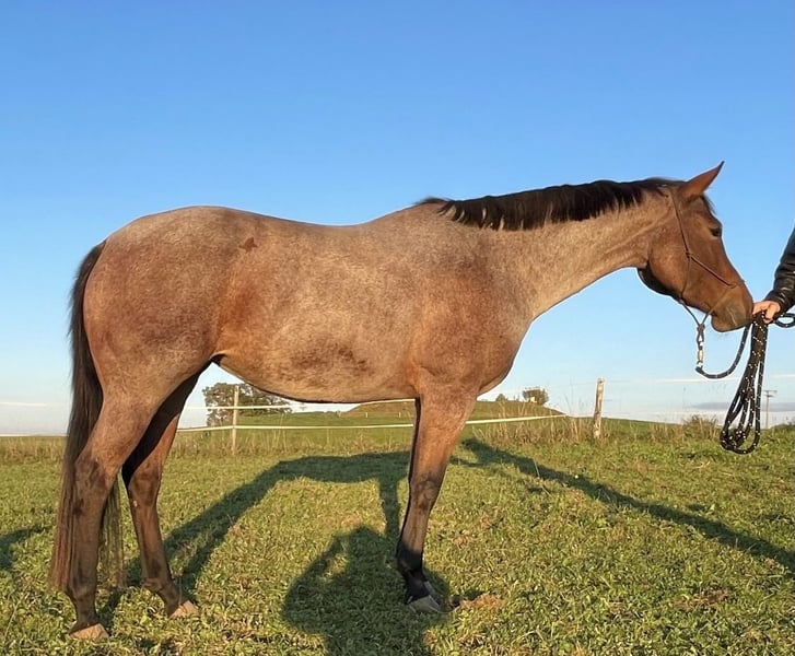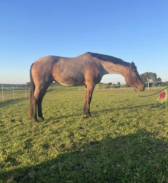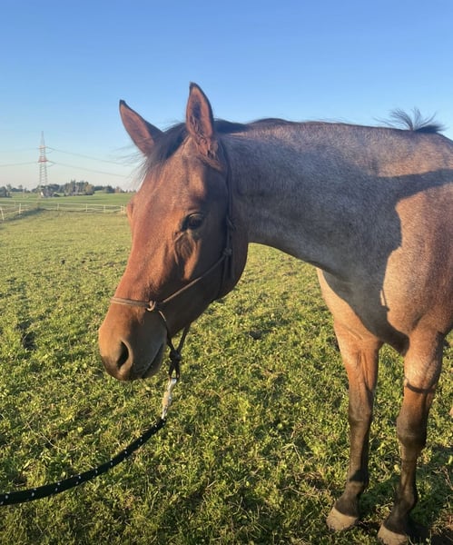 Beautiful Quarter Horse mare for sale due to lack of time: Diesel Only x Gunners Last Oak Ida is a 5-year-old beauty in a bay roan color, standing approximately 15.4 hh, born in May 2021 at my stable. She has an elegant and attractive head, a well-proportioned appearance, and a very friendly and approachable demeanor. She was gently backed in 2025 and has completed six months of basic training with a professional. She is highly trainable and eager to work, needing to be exercised about five times a week. She loves trail obstacles. Ida lives in a small herd of three mares in an open stable and is the lowest in the herd hierarchy. Her only drawback is a fear of cows, so she is not suitable for riding in areas with free-ranging cattle. She behaves perfectly in the indoor arena. I am looking for a calm and experienced person who can provide her with security, ideally in a pasture-based environment with a small herd or box stall housing with daily turnout and access to an indoor riding arena, to satisfy her need for activity. With further training, I can very well imagine her competing in all-round classes, and she would also be of interest for breeding. Due to her age, she is not suitable for beginner riders. Location: Allgäu Further information gladly by phone: 0162 / 822 34 72