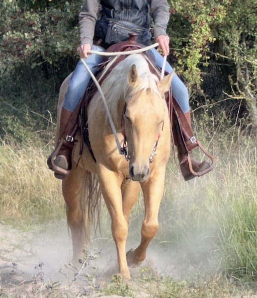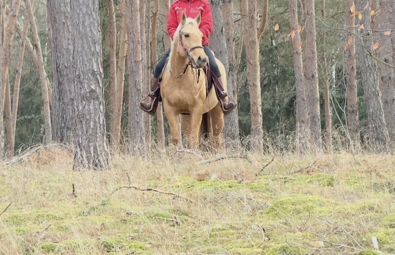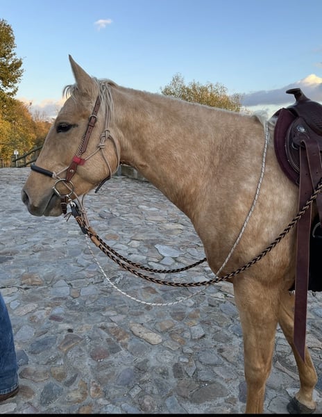 Geboren 2020, PSSM1HYPP,HERDA,GBDE,MH,MYHM : N/N Farbe: Palomino Roan. Ausbildungsprogramm Parelli Natural Horsemanship, Bodenarbeit, Geländefreizeitreiten. Sie geht alleine in das Gelände /Wald, Straßenverkehr sicher. Alle Sparten des Westernreitens stehen offen. Wird mit langem Zügel geritten. Bei dem Vorbesitzer hatte sie ein Fohlen geboren. Unsere Stute ist gesund, geht Barhuf, steht im Offenstall. Ein ganz neuer passender Markensattel könnte mit erworben werden. Bei Interesse alles persönlich.
