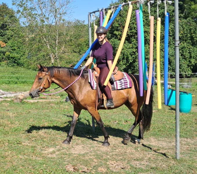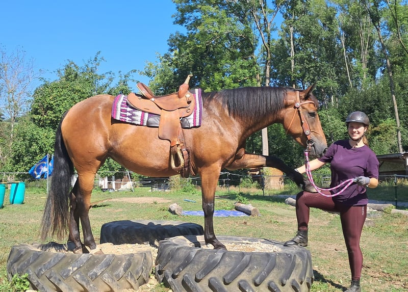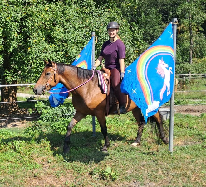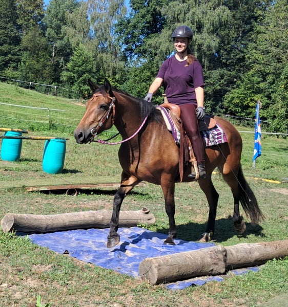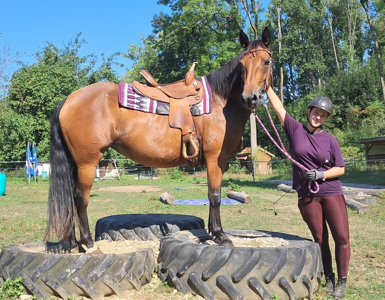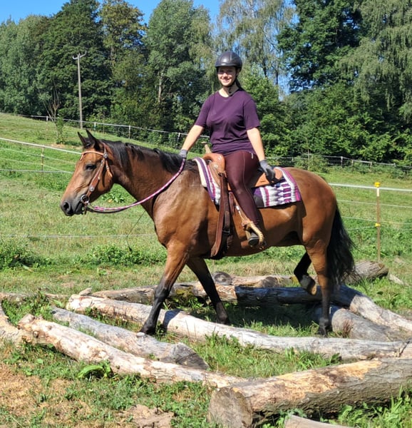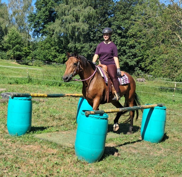 Bella, sometimes a bit of a princess ;-) A friendly, brave mare, well-behaved around people and other horses, confidently ridden in leisure riding, with a good seat, and up for any fun. Those who get along well with her will find a dream horse at a small price. Suitable even for determined teenagers—6 years old, 15.5 hh. Ideal for trail riding, terrain riding, and leisure outings. Both English and Western riding are possible. Accustomed to herd life and turnout, stable confinement is no problem. Equine passport available. All our horses are familiar with groundwork, different terrains, cars, agricultural machinery, as well as cows, donkeys, sheep, pigs, dogs, cats, and chickens. For more information and to arrange a viewing, please call 08536-2890292 (answering machine available) or 0157-78378455 (no mobile network at the yard). Please no private messages, emails, or WhatsApp inquiries! Sunday is our day of rest. Accessories and transport can be arranged at favorable prices. Each customer is granted a contractual six-week exchange period. Prices are fixed. No installment requests, please. Anyone arriving with a trailer and taking the horse immediately will receive a €100 discount. A €1,000 cash deposit is due upon purchase. If you want to take the horse immediately, full payment is required, of course. We offer clients the opportunity to join a ride with two horses of your choice, so you can get to know your dream horse and see if it’s the right fit. Each appointment costs €35, whether riding, leading, preparing, or just walking around. Any additional rider (friend, partner, sister, trainer…) pays the same if riding along; just watching costs us time and €20. This amount will be refunded on the same day if you purchase a horse. Due to multiple incidents, we kindly ask for honest information regarding rider weight. We reserve the right to refuse a trial ride on-site if the information is not truthful. For the well-being of our horses, we prefer not to exceed 120 kg. As this is a living animal, these are only impressions from the handler and do not constitute guaranteed characteristics of the horse. Additional horses/ponies are available in my other listings or upon request.