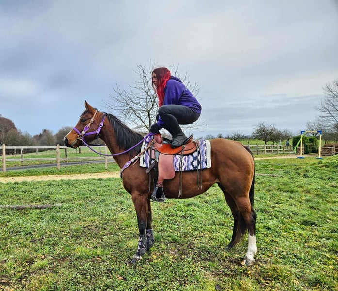 Quarter Horse mare „Simply Revolution“ – Reliable leisure partner with a heart Age: 6.5 years Height: approximately 15.2 hh Price category: €6,500 Pre-purchase exam: available ✨ Description: This 6-year-old Quarter Horse mare charms with her friendly nature and relaxed demeanor. „Simply Revolution“ is absolutely well-behaved in handling, very people-oriented, and reliable and eager to learn under saddle. She is familiar with both arena work and relaxed rides – alone or in a group. 🐎 Ideal for riders who: are looking for an uncomplicated young mare that convinces as a dependable leisure partner and is open to further training. A nice Western leisure horse that’s fun to ride! 🩺 Our horses are regularly: – dewormed – attended by the farrier – osteopathically checked 🛍 Farm shop: Western saddles, bridles, & accessories 🚛 Transport and equipment can be arranged affordably upon request Our services: ✅ 3-month exchange guarantee ✅ Trial ride: €35, each additional horse €25 (credited on the day of purchase) ✅ €100 immediate discount for pickup/transport on the same day ✅ Honest and personal advice 📞 Please inquire exclusively by phone: 0171 – 4001968 🕗 Available daily from 8 am to 8 pm ⚠️ No emails or WhatsApp messages ⚠️ All information provided without guarantee
