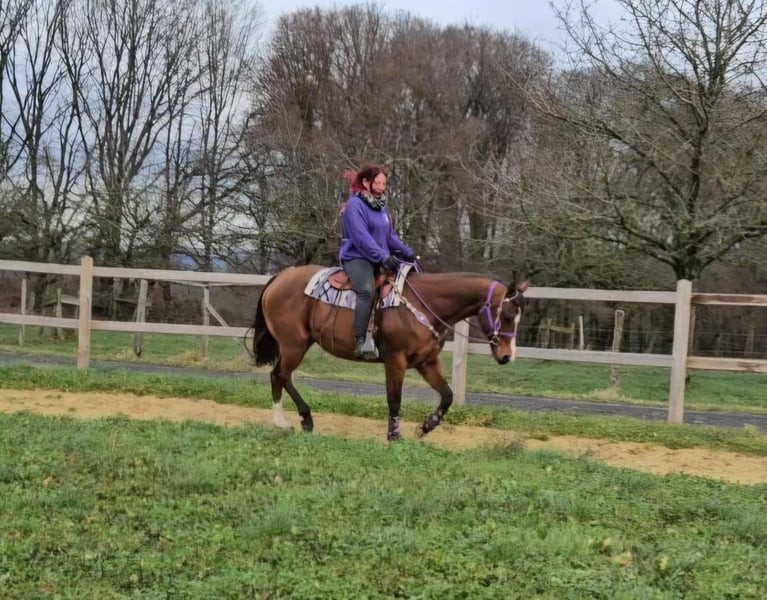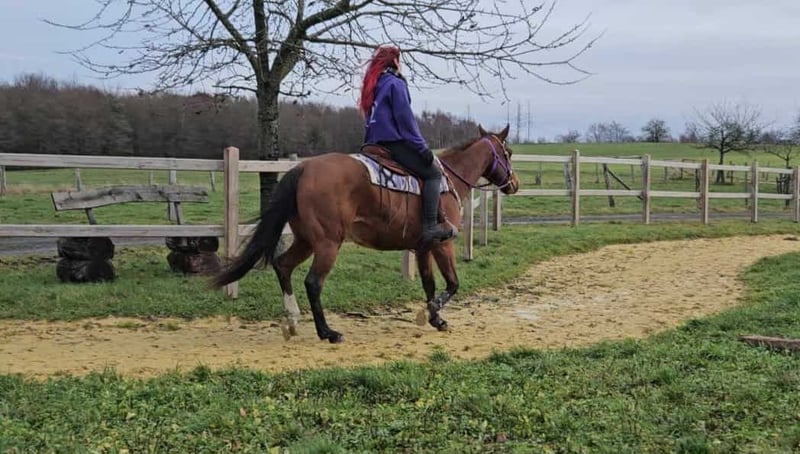 Jument Quarter « Simply Revolution » – Partenaire de loisirs avec cœur Âge : 6,5 ans Taille : environ 1,52 m Catégorie de prix : 6 500 € AKU : disponible ✨ Description : Cette jument Quarter de 6 ans séduit par son tempérament amical et sa nature détendue. « Simply Revolution » est parfaitement docile en main, très proche de l’homme et se montre fiable et volontaire sous la selle. Elle connaît aussi bien le travail en manège que les sorties tranquilles – en solo ou en groupe. 🐎 Idéal pour les cavaliers qui : recherchent une jument simple, jeune, fiable en tant que partenaire de loisirs et prête à progresser. Un joli cheval western de loisir, qui procure du plaisir ! 🩺 Nos chevaux sont régulièrement : – vermifugés – soignés par le maréchal-ferrant – contrôlés osteopathiquement 🛍 Boutique : Selle western, briderie & accessoires 🚛 Transport et équipement organisés à prix avantageux selon vos souhaits Notre service : ✅ 3 mois de droit d’échange ✅ Essai : 35 €, chaque cheval supplémentaire 25 € (facturés le jour même en cas d’achat) ✅ 100 € de remise immédiate pour retrait ou transport le jour même ✅ Conseils honnêtes et personnalisés 📞 Pour toute demande, merci de privilégier le téléphone : 0171 – 4001968 🕗 Disponible tous les jours de 8h à 20h ⚠️ Pas de mails ni WhatsApp ⚠️ Toutes les informations sont données à titre indicatif, sans garantie