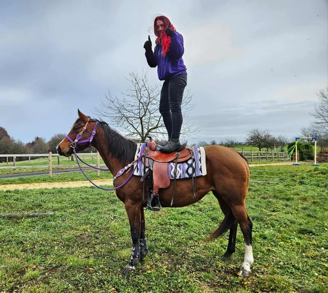 Quartermerrie „Simply Revolution“ – Vrijetijdsmaat met een hart Leeftijd: 6,5 jaar Stockmaat: ca. 1,52 m Prijsklasse: € 6.500 AKU: aanwezig ✨ Beschrijving: Deze 6,5-jarige quartermerrie betovert met haar vriendelijke aard en ontspannen karakter. „Simply Revolution“ is in omgang absoluut braaf, zeer mensgericht en onder het zadel betrouwbaar en leergierig. Ze kent zowel het werk op de piste als ontspannen buitenritten – solo of in een groep. 🐎 Ideaal voor ruiters die: een onbezorgde, jonge merrie zoeken die als betrouwbare vrijetijdspartner overtuigt en verder ontwikkeld kan worden. Een gezellig western vrijetijdspaard dat plezier geeft! 🩺 Onze paarden worden regelmatig: – ontwormd – door de hoefsmid verzorgd – osteopathisch gecontroleerd 🛍 Boerderijwinkel: Westernzadels, bit en accessoires 🚛 Transport en uitrusting naar wens goedkoop te regelen Onze service: ✅ 3 maanden ruilgarantie ✅ Proefrit: € 35, elk extra paard € 25 (bij aankoop op dezelfde dag verrekend) ✅ € 100 directe korting bij ophalen/transport op dezelfde dag ✅ Eerlijke en persoonlijke advies 📞 Voor vragen uitsluitend telefonisch: 0171 – 4001968 🕗 Bereikbaar dagelijks van 8.00 tot 20.00 uur ⚠️ Geen e-mail of WhatsApp ⚠️ Alle gegevens onder voorbehoud