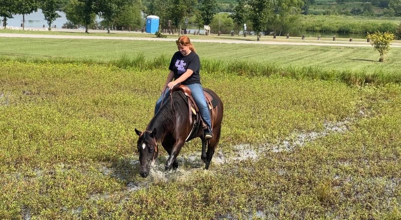 "AVAILABLE ON ONLINE HORSE AUCTION AT www DOT MagicHorseAuction DOT com BIDDING OPEN NOW thru TUESDAY | JULY 22nd - BUY IT NOW AVAILABLE! *Final price will be determined on auction site* CONSIGNOR CONTACT INFO: Tasha Ijames 270-844-2400 LOCATION: Henderson, KY Daisy is a gorgeous 7yr old dark bay mare standing about 15 hands tall and weighs around 1050lbs. She’s one hand broke and one that you can ride around with just a grass string. Daisy’s still young and has a lifetime ahead of her to spend and grow with a family. Daisy is a great trail horse. She is one that doesn’t care if she’s in the front, middle, or back of the pack. Daisy will cross all types of water, cross logs, go through mud, rough terrain, over bridges and is traffic safe. She’s not spooky out on the trail and will walk all day if asked. Not only is she great out on the trail, but Daisy has also been to team sorting and played with the cows. Daisy will walk, trot, and canter when asked and takes both leads. Daisy will ride out alone and away from the barn and be dependable. Daisy makes mounting simple as she will stand at a mounting block or anything you can find out on the trail for you to get on and will stand until asked to move. Daisy is currently shod all the way around. She stands great for the farrier, baths, tacking/untacking, and mounting. She’s easy to catch. She does great in a stall as well and has great stall manners. She loads in and out of the trailer easily. If you are looking for a lifetime partner to add to your family look no further. Daisy is a solid horse to go ride on the trails, in the arena or on the ranch. She has a very sweet demeanor and loving attitude. She loves to be groomed and absolutely enjoys the attention. We invite anyone and everyone to come meet and ride Daisy at our barn in Henderson, Kentucky. We are happy to assist with transportation arrangements. For any questions about Daisy please contact Tasha 270-844-2400