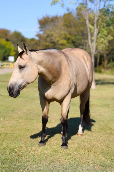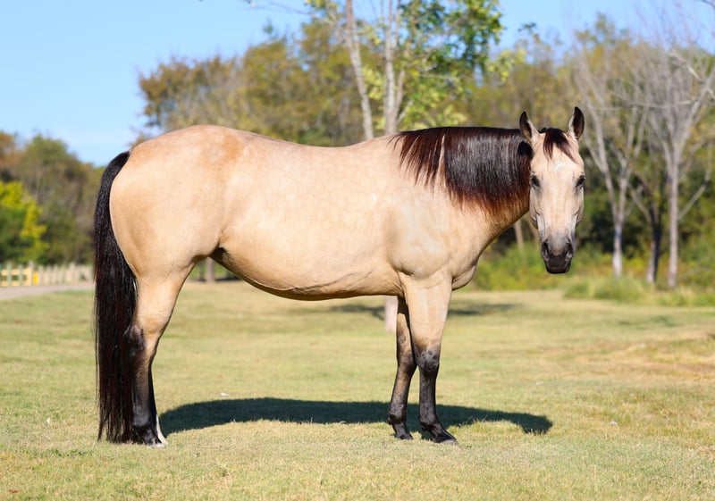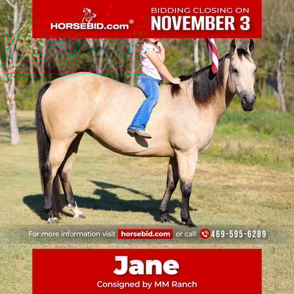 ⚜️𝐓𝐇𝐄 𝐅𝐀𝐋𝐋 𝐇𝐄𝐑𝐈𝐓𝐀𝐆𝐄 𝐂𝐋𝐀𝐒𝐒𝐈𝐂⚜️ Happening now thru MONDAY | NOVEMBER 3rd - Available EXCLUSIVELY on HorseBid's website! For more details and to register visit: www.Horsebid.com CONSIGNOR CONTACT: MM Ranch 469-595-6289 LOCATION: Forney Tx BREED: Quarter Horse REGISTERED: Yes REGISTERED NAME: Wick A Jane COLOR: Buckskin HEIGHT: 14.3 AGE: 8 GENDER: Mare 📝Meet Jane. Her registered name is Wick A Jane. She is just 8 yrs old. 🪩This girl is as classy and stunning as they make them. Plus she is a bombproof all around type anyone can ride. Stands the perfect size at 14.3 hands tall. She is a stout, thick, wide made girl. 🔎Jane has an old soul, been-there-done-that personality that makes her the go-to for a quiet enjoyable ride. She is both well trained and well behaved in any scenario or discipline. She is quiet and soft to ride in or out of the arena, alone or in a group. Not at all skittish, jumpy or reactive yet sure-footed and nimble through coarse uneven terrain. Has a ground covering walk, a silky smooth jog, and a dreamy lope all on a loose rein or even no bridle at all! Not forward or pushy making her a terrific step up for a novice rider looking for a confidence builder or babysitter to show them the ropes! Very forgiving and patient both on the ground and under saddle. She rides English as well and has been schooled over cross rails up to 2ft. She ready to go show with endless potential to progress. She has enough of a handle to participate in local fun shows or 4H and also pull her weight around the ranch doing chores. 🕰️Jane has spent plenty of late nights around the roping pen as well as early mornings trotting out to move cattle. She is no stranger to a hard days work and is a blast to use! Side passes to open and close gates, rides anywhere in the group, has snubbed colts, drug logs, crosses water, easy to catch wherever you find her, loads and hauls like a dream, stands tied quietly, great for the farrier. ❤️Jane is absolutely a favorite among everyone that meets her. I can not express enough how safe she truly is. This mare wants to please and wants to take care of her rider. She has zero and I mean zero bad habits. You will not get hurt around this mare. Unless you are just drunk and fall off. 👍🏼Did I mention how stunning she is. She is gorgeous buckskin with big dapples in her coat. Her tail grows extremely fast. We have to cut it monthly to keep it from dragging the ground. She is such an easy keeper. No maintenance or special things for her. No warming her up before you get on to ride either. You can get on her fresh out on the pen and go. She is not silly or high strung. She is truly a once in a lifetime type horse. 💯She is sound in every way. Even sound to bred if you a good minded pretty baby! 🌎We can help with making affordable shipping arrangements.
