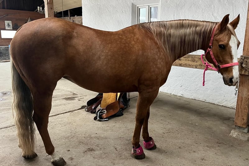 Coole, 8 jährige Quarter Horse Stute in dunkel Palomino sucht ein neues Zuhause! Sie wird weit unter wert wegen eines Zufallbefundes verkauft. 155 cm Stckm Benötigt vorne Eisen Direkte Tochter von Yellow Jersey und Enkelin von Wimpleys little Step! Lebensversicherung im Gelände 6 - Pannel/Test negativ Unkompliziert im Umgang Für Anfänger/Wiedereinsteiger geeignet Schulpferd/Therapiepferd geeignet Anfragen bitte nur telefonisch unter 0179/4075376 Wird nur als Freizeitpferd verkauft! Um Reittourismus vorzubeugen werden 35 Euro verlangt!