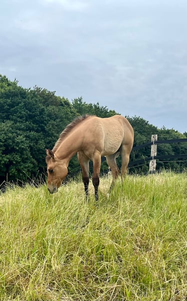 Shiny is a 9-year-old Quarter Horse mare that impresses with her pleasant rideability, honest nature, and versatile training. She has been solidly trained in reining and qualified for the EWU German Open (Young Horse Reining & Basic) at age four, finishing 11th in the Basic. Today, she possesses a good foundation in training and is familiar with reining maneuvers, as well as trail riding, terrain, and cattle work. Thanks to her beautiful movement and her expressive, ground-covering trot, she is also likely to be suitable for ranch disciplines. She can be ridden confidently both alone and in groups in the terrain, and is very reliable. Shiny is also a real treasure from the ground; she is accustomed to herd life but also stands well alone. Loading, farrier visits, and veterinarian care are no problem for her. Her health is regularly maintained through vaccinations, deworming, dental care, and osteopathic treatment. She has tested N/N on the 6-panel genetic test. Shiny is also interesting for breeding – in 2023, she successfully foaled a foal via embryo transfer (artificial insemination). A picture of her foal from 2023 can be seen in the third photo. For more information and a video, please feel free to send a message to +49 151 70117054.
