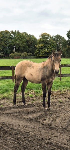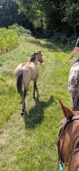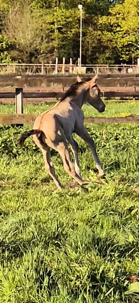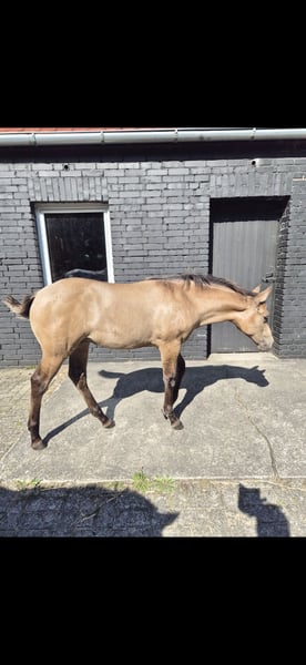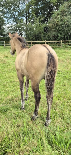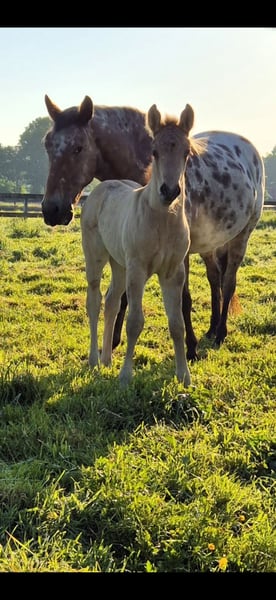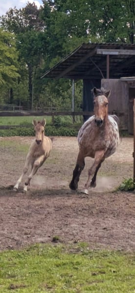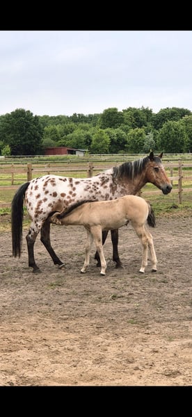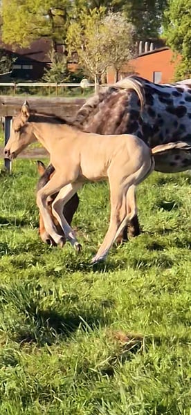 Ich biete mein bildhübsches Stutfohlen von 22.04.25 in Liebevolle hände an. Sie zeigt sich sehr menschbezogen, neugierig und brav im täglichen umgang. Sie kennt halfter, fliegenmaske, hänger und hufschmied. Und ist regelmäßig entwurmt. Kann jetzt abgesetzt werden. Sie wird ein endmaß von etwa 1.52m bekommen. Gechipt und mit equidenpass. Vater ist ein QuarterHorse 'Jeannes Happy Light' und mutter ist ein QuarterHorse X Appaloosa (ohne papiere) Sie ist 6 Panel N/N