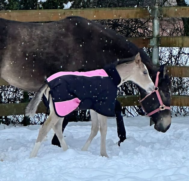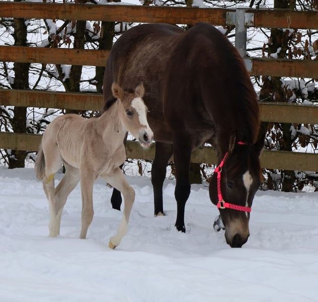 GOTTA LOPIN LUCINDA, geb. 26.01.2026, buckskin Da haben unsere "Liz Gotta Gun" (Lisbeth) und unser "Blackberry" ein wirklich zuckersüßes Stutfohlen gezaubert - da kann man einfach nur sagen, die Anpaarung passt. "Lucinda" hat von ihren Eltern alle positiven Eigenschaften mitgekommen: einen korrekten Körperbau und Beinstellung, viel Charme und Typ, Bewegungspotential und sie wird sicherlich ein zuverlässiger Reitpartner, wie ihre Eltern, werden, so dass eine pferdebegeisterte Familie bestimmt viel Freude mit ihr haben kann. Auch wird sie ein gutes Reitpferd für Reining und die Ranch Horse Klassen, wie Ranch Riding, Ranch Trail, Ranch Rail und auch im Allround-Bereich abgeben. Dafür spricht auch ihr Pedigree, in dem sich viele hochwertige Vererber und Legenden der QH-Zucht finden, wie z.B. Hollywood Dun It, Grays Starlight, Smart Little Lena, Continental King und King P-234. Das AQHA-Papier online einsehbar und auf dem Postweg zu uns, in Kürze wird sie gechipt und der DQHA-Equidenpass incl. Zuchtbescheinigung beantragt. Beide Eltern haben einen 5 Panel-Test und IMM/MYH1-Test. Wie alle unsere Fohlen wächst sie mit Gleichaltrigen und anderen Pferden in der Herde auf und wird sachkundig aufgezogen. Regelmäßige Wurmkuren und Termine beim Hufschmied sind bei uns eine Selbstverständlichkeit. Bei Verkauf wird sie lebensversichert incl. tierärztliches Gesundheits-Gutachten. Kosten und Risiko bleiben bis Übergabe (=vollendetes 6. Lebensmonat) bei uns. Auf Wunsch und Kosten des Käufers Einzahlung in die Futurity der NRHA und der NSBA (ab heuer möglich) sowie Jungpferdeprogramm der EWU. Ihre Eltern und mehrere Halbgeschwister sind bei uns auf dem Hof zu besichtigen. Auf den letzten Bildern sind ihre Eltern zu sehen. Tel. 0170/4443194 Viele Bilder und weitere Infos unter www.goetz-quarterhorse.de