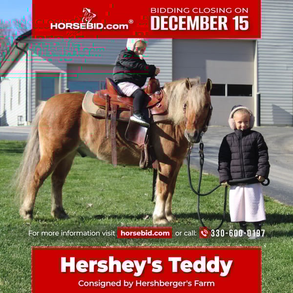 🎄𝐓𝐇𝐄 𝑯𝒐𝒍𝒊𝒅𝒂𝒚 𝐂𝐋𝐀𝐒𝐒𝐈𝐂🎄 Happening now thru MONDAY | DECEMBER 15th - Available EXCLUSIVELY on HorseBid's website! For more details and to register visit: www.Horsebid.com CONSIGNOR CONTACT: Hershberger's Farm 330-600-0197 LOCATION: Millersburg, OH BREED: Quarter Horse X Pony REGISTERED: No COLOR: Buckskin HEIGHT: 13 AGE: 9 GENDER: Gelding WOW!! Here is a stand out Quarter Horse X Pony that is very sweet and gentle to be around! And he's that unique color! Teddy has been here on our farm for the last 5 years and has given a lot of pony rides and has done about everything there is to do here on the farm. He is that perfect size, small enough for the kids to ride, yet stout enough for the adults. Teddy lopes off real nice and picks up both leads. He has also done some small jumps. He adjusts to the riders level, If an experienced adult or kid rides him he has a very good handle, but if a beginner gets on him he will be careful and take care of his rider. He is very friendly in the barn and loves treats. Teddy stands great for the farrier and to get a bath. He has also been driven in a cart a lot and drives single or double. Teddy does great out in heavy traffic and big crowds. If you are looking for that perfect pony for your kids or grandkids, Teddy checks all the boxes and will always take great care of your kids!!!!!