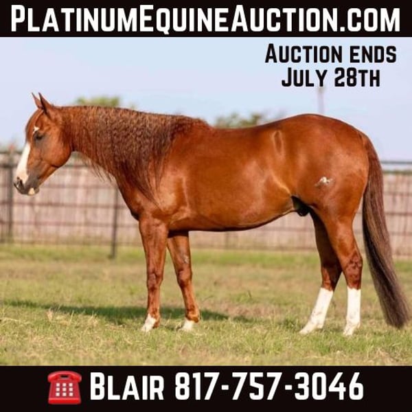 ONLINE AUCTION Place your bids at www.PlatinumEquineAuction.com Starting Bid $3500 Auction ends July 28th, 2024 Need a new saddle? Check out White Rock Saddles on our website or Facebook! HH Spoonshine aka “Shiner” is a 2016’ AQHA sorrel gelding. If you’ve seen Yellowstone and you’ve been waiting to find a horse like the fancy ones showing off in the arena, but also need him safe and forgiving for a novice rider, this is YOUR guy! Shiner is DROP DEAD GORGEOUS and checks absolutely ALL the boxes! He is BROKE BROKE BROKE. He handles like the best of them, and is puppy dog gentle. He’s extremely kind and absolutely SAFE! He’s done just about everything in the book from roping to 4H and was started by reiner. He also has roped both ends and was exceptional on the heel side years ago! If you’re looking for as handy broke as they come AND safe, you really don’t want to miss this guy! It’s not often you come across something with this much talent, brains, looks that you can throw your grandma on! Shiner will take care of any rider and is calm cool and collected in any situation. He’s exceptionally easy to operate and moves off the slightest rein pressure. He’s not spooky in the slightest and has ZERO buck, bolt or rear. Anyone will be able to have an absolute BLAST on this guy! He makes it easy and all his fancy buttons are very user friendly and even a beginner will be able to pick his reins up and turn him around. Shiner has been an absolute barn favorite since he’s been here. He’s super friendly and kind and acts like a big dog! He has the best personality and only aims to please! He LOVES new adventures and will go absolutely anywhere you point him. We haven’t been on a more broke, civil, sane, gentle and SAFE gelding all year and this guy tops the chart for favorites we’ve ever had the pleasure to represent. We cannot say enough good things about this gelding and could go on for DAYS about him. He’s fancy, GORGEOUS, safe, gentle, kind, and just flat out easy all the way around. Shiner loads, leads, bathes, ties, and gets along with everyone and everything! He is UTD on teeth and feet and ready to go! He does require front end maintenance if you’re going to be using him hard, but is UTD on that and ready to go! Whether you’re looking for a rope horse prospect, trail horse, fancy weekend warrior, ranch versatility horse, 4H horse, fancy husband horse, fancy wife horse, fancy grandma horse, or if you just want to look the part and be SAFE and have FUN every ride, you absolutely cannot miss Shiner. Go to his website page northtexashorsecompany.com/shiner for more pictures and footage! Please call Blair with North Texas Horse Company for more info at 817-757-3046. We are located in Weatherford, TX and can help arrange affordable shipping to anyone!! ONLINE AUCTION Place your bids at www.PlatinumEquineAuction.com Starting Bid $3500 Auction ends July 28th, 2024 Need a new saddle? Check out White Rock Saddles on our website or Facebook!