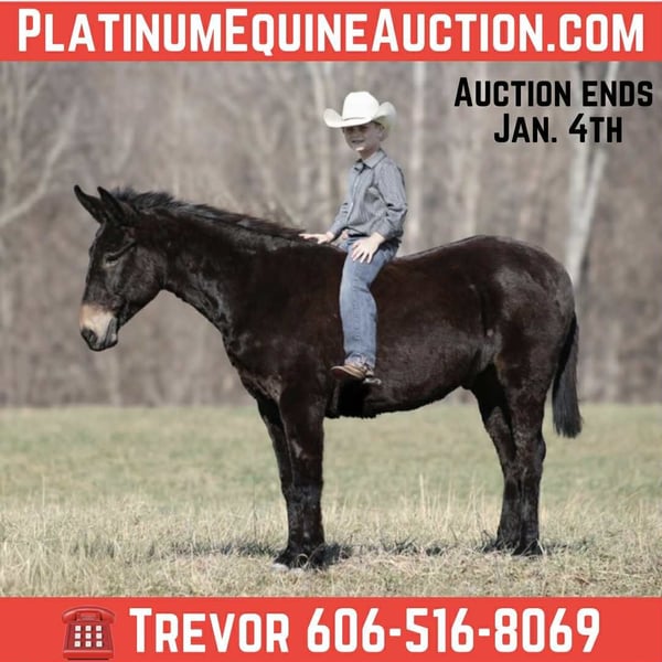 ONLINE AUCTION Place your bids at www.PlatinumEquineAuction.com Starting Bid $3500 Auction ends January 4th, 2025 Need a new saddle? Check out White Rock Saddles on our website or Facebook Jonah is a beautiful black John (gelding), he is a 10 yrs old and he stands a stocky built, 15 hands tall! This is one mule that is 100% no fuss-easy to ride! Whether you ride him every day or leave him off for a couple months, he rides gentle. My 7 year old nephew has ridden him around the farm and though the trails. Jonah is very laid back, rides on a loose rein and is never in a hurry. Jonah is not spooky and has miles and miles of experience from the mountains to the valleys he will cross anything that he is asked to from rivers to creeks, scale steep slopes while being sure footed and picks his path is a tight situation. He can handle the rough rocky trails, steep inclines and deep water… nothing bothers him and he feels right at home on the trails! He has been ridden around cattle. Jonah has been hauled on week long and weekend trail rides. He has been ridden by all members of our family. He loads right up with no issues. Jonah has a smooth lope although his favorite thing to do is walk on a loose rein and enjoy the scenery. He picks up his leads and rides in the arena as well as outside. Dogs do not bother him and is traffic safe! Jonah has no issues with his ears. Call Trevor Patrick 606-516-8069 with any questions. Located in Brodhead, KY. ONLINE AUCTION Place your bids at www.PlatinumEquineAuction.com Starting Bid $3500 Auction ends January 4th, 2025 Need a new saddle? Check out White Rock Saddles on our website or Facebook