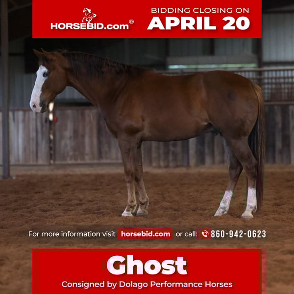 ⚜️𝐭𝐡𝐞 𝓔𝓵𝓲𝓽𝓮 𝐒𝐩𝐫𝐢𝐧𝐠 𝐂𝐥𝐚𝐬𝐬𝐢𝐜⚜️ Happening now thru MONDAY | APRIL 20th - Available EXCLUSIVELY on HorseBid's website! For more details and to register visit: www.Horsebid.com CONSIGNOR CONTACT: Dolago Performance Horses 860-942-0623 LOCATION: Ripley, OK BREED: Quarter Horse REGISTERED: No REGISTERED NAME: Ghost COLOR: Sorrel HEIGHT: 15.2 AGE: 10 GENDER: Gelding Everyone meet ghost! He is a 10 yr old sorrel gelding with a bald face who stands at 15.1 hands weighing 1100lbs. This boy has got it all… the ride, the confirmation, the color, and the looks! He’s got great confirmation with a big hip thick neck and straight legs. Now his blue eye and bald face is where his looks truly are! He’s not all looks though he’s got a great mind and great ride! This gelding is a calm quiet and dependable gelding! He has a soft eye and a personality that never bothers anyone… horse or person. You will never have to stress about this horse; he can go out with anyone, easy keeper in all aspects! He is extremely gentle anyone in the family can ride him and in return he’ll be wanting attention from everyone! He is in your pocket and as sweet as they come. In and out of the arena you can rely on this horse for anything you need done with him. Outside of the arena he is a proven trail horse who has been trail rode all day especially in those mountain states! He’s got no spook so he’ll walk right into anything with no fuss. Rivers, lakes, logs, badlands, he’s done and seen it all. You and your whole family can enjoy this horse on a all day long trail ride! He has also proven himself on the feedlot and on the wheat field! He’s been used on the feed lot for full days with different hands riding him! He’s so easy to get along with anyone will ride him and love him! In the arena he is soft, gentle, and as smooth as a cloud! You can enjoy this horse all day, everyday, anywhere and have the same horse every time! He is truly a good egg!