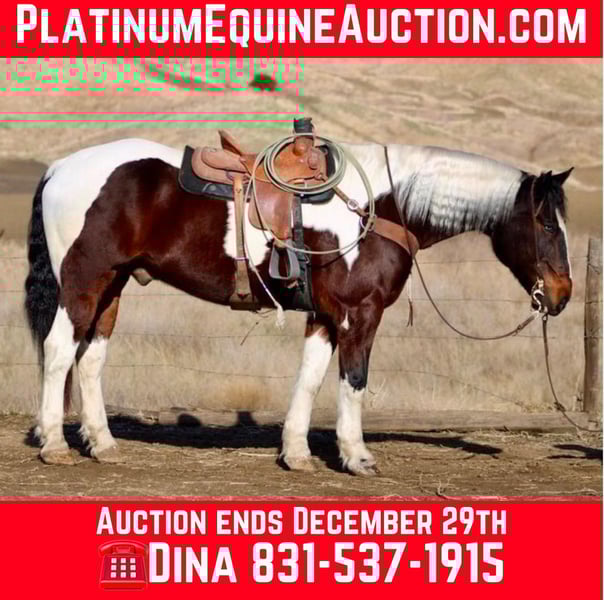 ONLINE AUCTION Place your bids at www.PlatinumEquineAuction.com Starting Bid $3500 Auction ends December 29th, 2024 Need a new saddle? Check out White Rock Saddles on our website or Facebook! Meet Bison… The gentle giant who will make your New Year unforgettable! This stunning 8-year-old tri color paint draft cross gelding is stunning with one blue eye standing at 16 hands, embodying strength and grace all wrapped up in one big puppy dog of a horse. Bison will greet you at the gate and put his nose in the halter he loves attention. Whether you’re gathering cattle or dragging calves to the fire or just enjoying a leisurely ride through picturesque state parks, he will calmly go out alone or with a groups of friends. He is great in the pasture with mares and geldings and is just as content in a stall setting. Bison is your go-to partner for any adventure. He calmly crosses flowing rivers and gracefully walks over downed trees while taking in the sights of wildlife with an air of confidence. With his impressive neck rein and sliding stop, this boy knows how to pick up leads like a pro in the arena making him perfect for riders from beginners to advanced he is a confidence builder. He’s also quite the star when it comes to parades, strutting his stuff like he owns the spotlight! But don’t let his good looks fool you; Bison has mastered obstacles too navigating bridges, car washes, and even tires with ease while looking effortlessly stylish whether dressed in English or Western tack. He has carried flags and is not bothered by tarps or balls he is just and easy going boy. He rides bareback in just a halter. You can stand on him slide off his butt and crawl all over him! Riding him feels like sinking into a plush couch; he’s as comfortable as they come! Plus, he’s easy to clip, show off at events or haul around town. He is not concerned about cars, semis or pedestrians. Bison tacks up easy stands for mounting and enjoys grooming sessions he is shod all the way around and good for the farrier. If you’ve been searching for that special equine companion who embodies both heart and versatility. Bison is waiting to meet you at Longhorn Ranch! Located in Paicines, CA contact Dina 831-537-1915. ONLINE AUCTION Place your bids at www.PlatinumEquineAuction.com Starting Bid $3500 Auction ends December 29th, 2024 Need a new saddle? Check out White Rock Saddles on our website or Facebook!