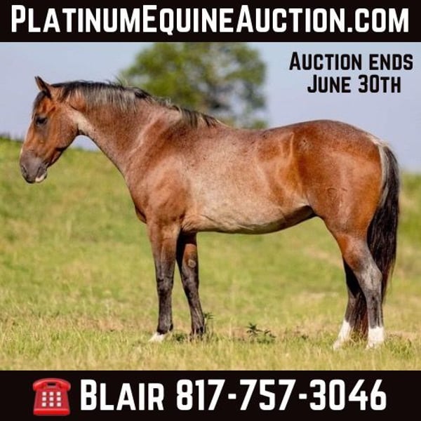 ONLINE AUCTION PLACE YOUR BIDS AT PLATINUMEQUINEAUCTION DOT COM $3500 STARTING BID AUCTION ENDS JUNE 30TH Banks is a 14.2H, 8 yr old bay roan gelding. He’s super unique, GORGEOUS, thick and is ready to go in absolutely any direction! He is safe, gentle and incredibly easy to get along with. Banks has been mainly used on trails and has some experience pushing cows on a ranch. He’s a very sweet, personable horse that’s eager to please! He’s easy to ride, will neck reins, switch gaits and stop when asked with no issues! He isn’t spooky and has zero buck, bolt or rear. Banks would make the perfect trail horse as he is, or has the potential to make a ranch/rope horse prospect! He is athletic enough to make an arena prospect as well if desired. Whichever way you take him, you’re sure to love him! He goes through/over an obstacles you put in front of him and crosses water! Banks loads, leads, bathes, ties and loads great. He’s easy to get along with and gets along with everyone great. He just had his teeth done by an equine dentist and is freshly trimmed. Banks is ready for his home and someone is going to get an easy to operate, safe, uniquely gorgeous, personable new ride! Go to his website page northtexashorsecompany.com/banks for more pictures and footage! Please call Blair with North Texas Horse Company for more info at 817-757-3046. We are located in Weatherford, TX and can help arrange affordable shipping to anyone!!
