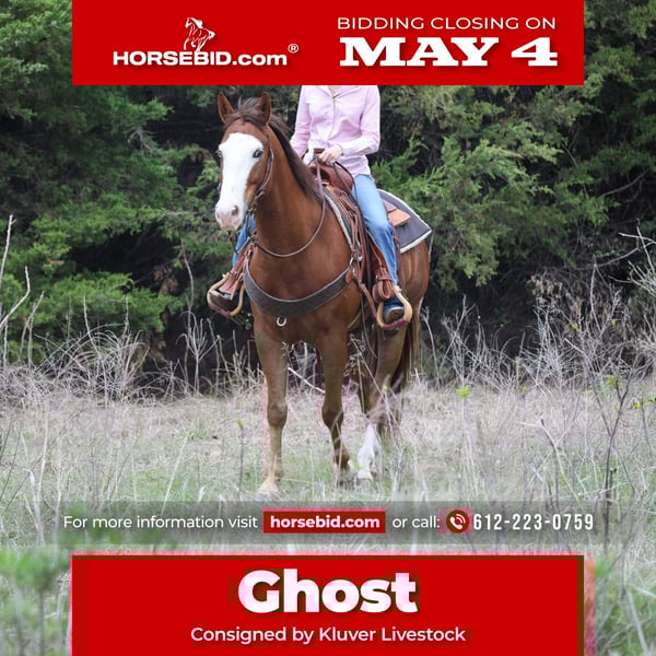▪️▫️◾️𝐭𝐡𝐞 𝑴𝒂𝒚 𝐒𝐞𝐥𝐞𝐜𝐭◾️▫️▪️ Happening now thru MONDAY | MAY 4th - Available EXCLUSIVELY on HorseBid's website! For more details and to register visit: www.Horsebid.com CONSIGNOR CONTACT: Kluver Livestock 612-223-0759 LOCATION: Ripley, OK BREED: QH REGISTERED: No REGISTERED NAME: Ghost COLOR: Sorrel HEIGHT: 15.1 AGE: 10 GENDER: Gelding Everyone meet ghost! He is a 10 yr old sorrel gelding with a bald face who stands at 15.1 hands weighing 1100lbs. This boy has got it all… the ride, the confirmation, the color, and the looks! He’s got great confirmation with a big hip thick neck and straight legs. Now his blue eye and bald face is where his looks truly are! He’s not all looks though he’s got a great mind and great ride! This gelding is a calm quiet and dependable gelding! He has a soft eye and a personality that never bothers anyone… horse or person. You will never have to stress about this horse; he can go out with anyone, easy keeper in all aspects! He is extremely gentle anyone in the family can ride him and in return he’ll be wanting attention from everyone! He is in your pocket and as sweet as they come. In and out of the arena you can rely on this horse for anything you need done with him. Outside of the arena he is a proven trail horse who has been trail rode all day especially in those mountain states! He’s got no spook so he’ll walk right into anything with no fuss. Rivers, lakes, logs, badlands, he’s done and seen it all. You and your whole family can enjoy this horse on a all day long trail ride! He has also proven himself on the feedlot and on the wheat field! He’s been used on the feed lot for full days with different hands riding him! He’s so easy to get along with anyone will ride him and love him! In the arena he is soft, gentle, and as smooth as a cloud! You can enjoy this horse all day, everyday, anywhere and have the same horse every time! He is truly a good egg!