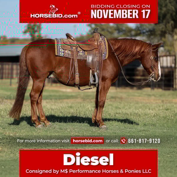 🎲𝓽𝓱𝓮 𝐑𝐈𝐃𝐄𝐑'𝐒 𝓒𝓱𝓸𝓲𝓬𝓮🎲 Happening now thru MONDAY | NOVEMBER 17th - Available EXCLUSIVELY on HorseBid's website! For more details and to register visit: www.Horsebid.com CONSIGNOR CONTACT: M$ Performance Horses & Ponies LLC 661-817-9120 LOCATION: Stephenville,Texas BREED: Quarter Horse REGISTERED: Yes REGISTERED NAME: Doc Bob Cat COLOR: Sorrel HEIGHT: 14 AGE: 10 GENDER: Gelding When elite breeding, timeless style, and true versatility come together — you get Diesel. Doc Bob Cat, this 2015 AQHA gelding stands 14 hands of pure confidence and quality. He’s an own son of Trapper Cat and a grandson of the iconic High Brow Cat, with Bob Acre Doc on the bottom side — a pedigree stacked with the legends of the cutting and cow horse world. Diesel carries that same presence, mind, and talent that made his lineage famous. This stunning gelding is as fancy broke as they come — low-headed, collected, and soft in the bridle. He moves like silk through the arena, loping perfect, cadenced circles and melting into big, stylish stops. His turnaround is correct, his handle refined, and his attitude pure class. Diesel is polished and ready to step into the ranch riding or versatility pen — he’s the kind that always looks the part. Out on the ranch, Diesel has done it all — gathering, sorting, and doctoring cattle with the steady confidence of a seasoned hand. He’s a finished heel horse and a finished breakaway horse — quiet, composed, and money-in-the-bank every trip. He’s the one you can trust to stay cool under pressure and deliver when it counts. Take him to the show pen, the roping pen, or down the trail — Diesel handles it all with grace. He rides out alone or with company, crosses water, bridges, and brush without hesitation, and never loses his steady, level-headed nature. He’s gentle. He’s dependable. He’s pure class. From his royal pedigree to his calm, collected mind, Diesel is the kind of gelding that elevates any program — a true luxury performance horse built on integrity and talent. Easy to catch, stands tied like a statue, loads and hauls with ease, and always presents himself like the professional he is. We are open to anyone interested in him to schedule a time to come see him or if you can’t make it schedule a FaceTime showing to see him. If you need help with transport don’t hesitate to ask we have a list of reputable haulers that can get him safely to your doorstep WORLD WIDE including, Alaska , Mexico, Hawaii, Canada and anywhere in between.