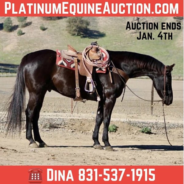 ONLINE AUCTION Place your bids at www.PlatinumEquineAuction.com Starting Bid $3500 Auction ends January 4th, 2025 Need a new saddle? Check out White Rock Saddles on our website or Facebook BLACKBERRY — 15.1 Hands • 11-Year-Old Black Gelding English or Western • Collected • Smooth • Elegant • Trail-Confident Blackberry is the kind of black gelding that makes people look twice — not just because he’s jet-black and good looking, but because he carries himself with a refined, classy style that you can feel the moment you swing a leg over. He has a smooth, fluid way of moving, a naturally balanced frame, and that “put together” ride that’s hard to find. He rides English or Western and does it with the same quiet confidence. Blackberry is soft in the bridle, willing to stay collected, and has an elegant feel without being dull. His gaits are comfortable and easy to sit, and his transitions are smooth and enjoyable — the kind that make you feel like you’re riding a horse that’s been brought along the right way. He settles in, stays with you, and makes the ride feel easy. On the trails he is — relaxed, and content to travel out and cover country. He goes along with a steady, confident attitude and doesn’t act like every new thing is a reason to get worried. He’s been over bridges and tires, handles obstacles with a level head, and keeps his rider feeling secure. Add in pool noodles, tarps, and the usual “trail surprises,” and he stays the same kind of horse — thinking, listening, and moving through it without making a big deal. He’s also easy to have in your day-to-day program. Blackberry is easy to tack up, stands for what you need, and is pleasant to be around. He does well in a group setting and rides out nicely with other horses, and he’s also comfortable venturing out — whether that means leaving the barn alone or just being the one that leads the pack when everyone else wants to stop and stare. He’s the type that lets you go enjoy your ride instead of managing your ride. Blackberry is happy being kept in a stall or turned out in pasture, and he settles in well either way. If you’re looking for a gelding with a polished, classy feel in the arena and a steady, happy mind on the trails, Blackberry is one you’ll be proud to have in your barn. For more info or to come try him: Longhorn Ranch — Dina 📞 831-537-1915 📍 Paicines, CA ONLINE AUCTION Place your bids at www.PlatinumEquineAuction.com Starting Bid $3500 Auction ends January 4th, 2025 Need a new saddle? Check out White Rock Saddles on our website or Facebook