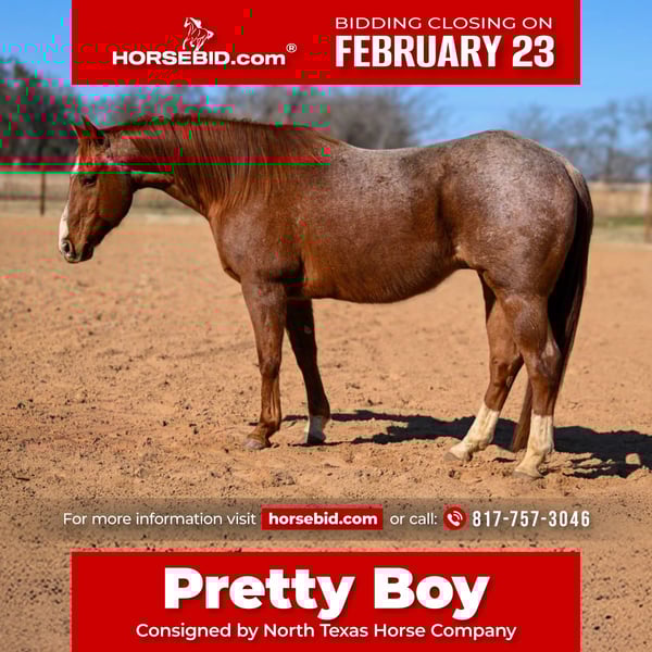 💎 𝐓𝐇𝐄 𝓓𝓲𝓪𝓶𝓸𝓷𝓭 𝐒𝐇𝐎𝐖𝐂𝐀𝐒𝐄 💎 Happening now thru MONDAY | FEBRUARY 23rd - Available EXCLUSIVELY on HorseBid's website! For more details and to register visit: www.Horsebid.com CONSIGNOR CONTACT: North Texas Horse Company 817-757-3046 LOCATION: Weatherford, TX BREED: QH REGISTERED: Yes REGISTERED NAME: Roan Pretty Boy COLOR: Red roan HEIGHT: 14.3 AGE: 12 GENDER: Gelding Roan Pretty Boy aka “Pretty Boy” is a 14.3H, 12 yr old red roan gelding that EVERYONE is sure to love. He is such a sweetheart! Pretty Boy has been used as a trail horse the majority of his life. He rides great inside the arena and out! He’s the kind that you can go solo trail ride and he’ll never make a fuss about being alone. He is very user friendly and anyone who rides him will get along with him! Pretty Boy is safe with zero buck, bolt or rear and truly aims to please! He is absolutely as comfy as a couch! He is the perfect size where he doesn’t feel intimidating but you also don’t feel like you’re too close to the ground. He handles all things inside and outside the arena with ease. He neck reins good and stops exactly when you ask him to! Pretty Boy is easy to get along with in all aspects and loads, leads, bathes and ties great! He would be the perfect fit for the trail rider looking for something handy and fun or the novice arena rider looking for a confidence booster! He is UTD on teeth, feet and coggins! More pics and videos on his website page at northtexashorsecompany.com/prettyboy. Please call Blair with North Texas Horse Company for more info at 817-757-3046. We are located in Weatherford, TX and can help arrange affordable shipping to anyone!
