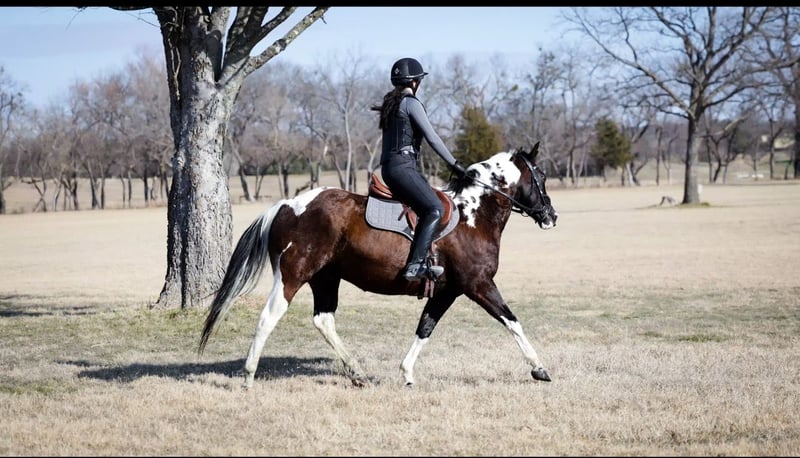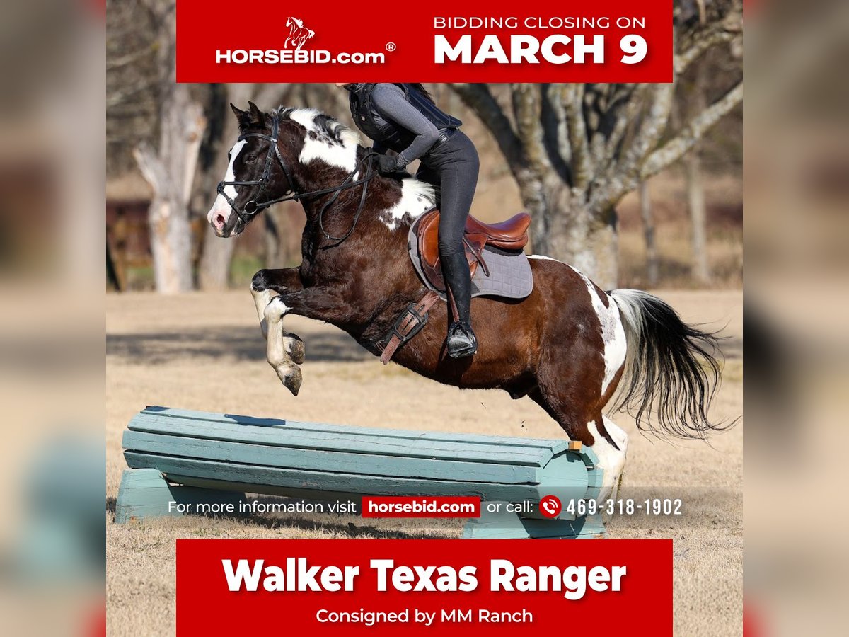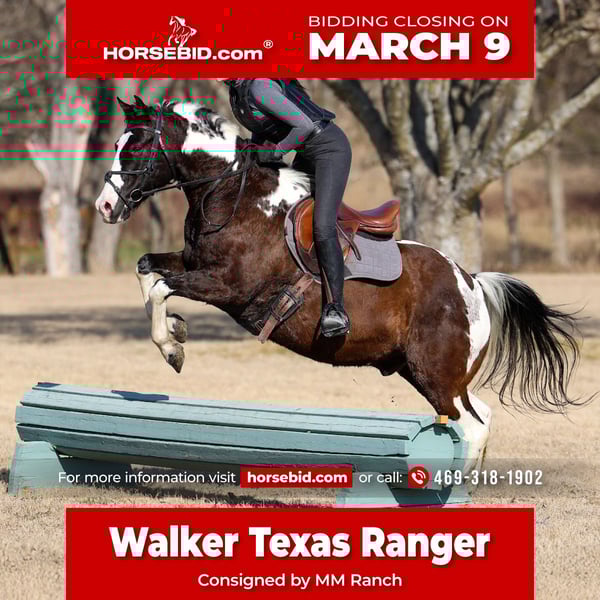 ℳ𝒶𝓇𝒸𝒽 ♦️𝐑𝐈𝐃𝐄𝐑'𝐒 𝐂𝐇𝐎𝐈𝐂𝐄♦️ Happening now thru MONDAY | MARCH 9th - Available EXCLUSIVELY on HorseBid's website! For more details and to register visit: www.Horsebid.com CONSIGNOR CONTACT: MM Ranch 469-318-1902 LOCATION: Forney, TX BREED: Quarter Horse REGISTERED: No COLOR: Paint HEIGHT: 15 AGE: 12 GENDER: Gelding This is Walker Texas Ranger. If you know you know. It was one of my all time favorite shows growing up. I can still sing the theme song till this day. It’s funny how he got that name. He came to us from a park ranger that had been riding him for work. So we would say go catch the park ranger horse. Which turned into Texas Ranger. Then Walker Texas Ranger. And the name just stuck. Which he is a badass like Walker Texas Ranger so he is deserving of the name. Walker is a 12 yrs old black and white paint gelding. Standing 15 hands tall. He is a wide as he is tall. Stout made. Lots of bone. Great confirmation. If you are looking for a safe, reliable, and truly versatile gelding, look no further — Walker is the one. He makes a statement of being a bombproof safe reliable family horse. Gentle, quiet, and dependable in every way, he is the type of horse that is hard to come by and even harder to let go of. Walker has been ridden both English and Western, making him suitable for a wide variety of riders and disciplines. Whether you want to enjoy a relaxing trail ride or ride in the arena! He has the mindset to adapt to whatever you ask of him. Walker has been roped on outside the arena some, and handles the job with ease and willingness. He has worked in the pens at the grow yards moving cattle and his easy side pass makes it so easy to open and close gates off of. He is the perfect candidate for working and checking your cows out on the ranch! He’s soft and supple in the sides. He is the same horse every time you saddle him. He rides off quietly, neck reins, and stays light in the bridle. He will walk, trot, and lope on a loose rein, and steps up willingly into a lope from a walk when asked without ever being hot or hard to handle. He has a silky smooth little soft lope. He is easy and fun to ride. He is a very pretty mover as well. He would make an excellent course country jumping horse. He is a natural. He took right to it with very little effort. You show him something once and he remembers it. Very easy to get to do new things on. His abilities are ended less. So ride him English or Western. You can’t go wrong. Out on the trails, he is an expert. He has had so much experience and been rode many miles. He was used for 3 years in the forest being used as a park rangers horse. He dang sure has been there done that type. He is steady and sure-footed. He crosses water, handles rough terrain, and doesn’t spook at the unexpected. He has even had a gun shot off and around him. Whether you ride alone or in a group, he stays calm, making him an ideal choice for anyone who values safety and confidence in their horse. He has the kind of mind and disposition that makes him suitable for any rider. Yes even first time riders. He is kind and forgiving for someone learning, yet broke and responsive enough for an experienced hand to enjoy. He is a standout gelding you can trust in any situation. It’s hard to find one this BROKE, and GENTLE! Plus has the color!! Bonus about him he is a super easy keeper. Requires no maintenance of any kind. He can go bare foot or put shoes on him. You can stall him or turn him out. Doesn’t matter to him. He is easy. PLUS he sells 100% sounds with no issues. He did have a pre vet evaluation done included in the pictures. If you have anymore questions about him feel free to call. We would love to visit with you about him. We can help you arrange shipping anywhere. He is up to date on all vaccinations, worming, had his teeth checked, feet. He is ready to go to his new home.