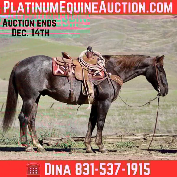 ONLINE AUCTION Place your bids at www.PlatinumEquineAuction.com Starting Bid $3500 Auction ends December 14th, 2025 Need a new saddle? Check out White Rock Saddles on our website or Facebook ANVIL — The Definition of a Ranch Horse Chestnut Roan • 15.1 Hands • 11-Year-Old Gelding Big • Broke • Feedlot Proven • Dependable All Day Long If you’re after a true using gelding with size, bone, and a steady, mature mind, Anvil is the one that stands out. This stout, uniquely marked chestnut roan gelding has spent his life doing honest work and doing it right. No drama, no hesitation, and no wasted motion — just , dependable, consistent effort day after day. Anvil is feedlot seasoned and knows the rhythm of real work. He handles cattle calmly and correctly, easing them through alleys, settling fresh pens, moving sick cattle with patience, and working gates without ever getting pushy or flustered. He stays steady in tight quarters, steady under pressure, and steady when things get hectic. He understands the job and handles it with quiet confidence. He’s equally solid outside the pens. Anvil has gathered big pastures, sorted pairs, checked fence lines, dragged calves, started roping out of the box and covered countless miles of varied country. He travels with purpose, keeps his feet under him, and never gets unsettled. He handles rough terrain, water crossings, steep country, rocks, brush, and mud with the kind of sure-footed balance only a seasoned horse develops. On the road, he is just as dependable. Anvil is excellent around cars, trucks, equipment, bicycles, noise, and traffic, never getting bothered or reactive. He confidently crosses bridges, steps through tires and obstacles, and works around flags and tarps without a second look. Whether you’re riding down a busy road or easing through town, he stays the same steady gelding. In the arena he rides like a true, broke horse. He’s soft in the bridle, moves willingly off your leg, stops when asked, and guides in a simple, honest, uncomplicated manner. He doesn’t need tuning because dependable is simply his nature. On the ground, Anvil is polite and easy to handle. He saddles quiet, stands tied, hauls trouble-free, and is respectful for the farrier. He gets along in both stall and pasture settings and carries himself with a calm maturity that’s hard to find. If you want a gelding with substance, experience, steadiness, and all-day dependability, Anvil is the kind you bring home and keep. He is big, broke, road-safe, obstacle-proven, and built for the long haul. Dina – Longhorn Ranch Paicines, California 📞 831-537-1915 Nationwide shipping available ONLINE AUCTION Place your bids at www.PlatinumEquineAuction.com Starting Bid $3500 Auction ends December 14th, 2025 Need a new saddle? Check out White Rock Saddles on our website or Facebook