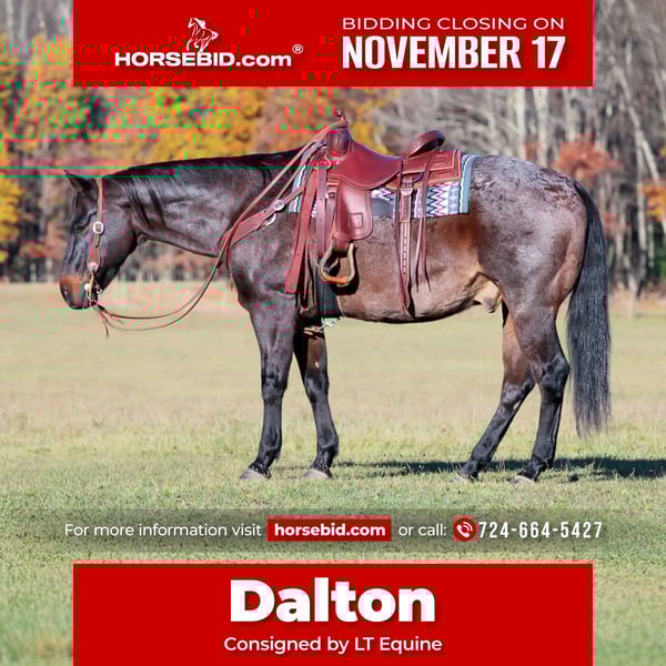 🎲𝓽𝓱𝓮 𝐑𝐈𝐃𝐄𝐑'𝐒 𝓒𝓱𝓸𝓲𝓬𝓮🎲 Happening now thru MONDAY | NOVEMBER 17th - Available EXCLUSIVELY on HorseBid's website! For more details and to register visit: www.Horsebid.com CONSIGNOR CONTACT: LT Equine 724-664-5427 LOCATION: Miola PA BREED: Grade (QH) REGISTERED: No REGISTERED NAME: Dalton COLOR: Bay Roan HEIGHT: 15.3 AGE: 11 GENDER: Gelding Introducing Dalton! He is a 9 year old Grade QH gelding that’s a bay/Blue roan. He might not be the most attractive horse you have ever seen but he is most definitely one of the safest, most kind, and EASY EASY horses you will ever ride! Dalton is the type of horse that is laid back and will do whatever you ask of him with a willing attitude and calm chill demeanor. He’s a big puppy dog! Literally he wants to be in your pocket. He is easy to catch, easy to lead, easy to halter, bridle and saddle. He stands stock still being tied. He would make a fantastic beginner horse or lesson horse for any program! Dalton has an easy soft one hand neck rein, he side passes and moves off leg. He will collect his head and has a smooth easy to sit jog and lope. He has been used as a ranch horse and a trail horse and a lesson horse. He will ride western or English. I can’t say enough good about him. He’s a barn favorite right now because he’s always the same chill guy no matter what day you pull him out. Dalton will ride out alone or in a group. Follow or lead, he does well with cowboy obstacles even if it’s something he doesn’t understand he try’s his best. If you’re looking for a reliable horse for friends as a spare horse, or a safe mount for your parents down to a trail or lesson horse please give Dalton a chance! You will not regret it. Dalton has a UTD Coggins and Rabies vaccination, reset on shoes, and a clean Health Check from the Vet, please watch his video and if you have any questions please contact me! Thank you and have a wonderful day!